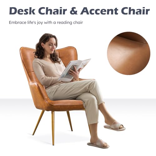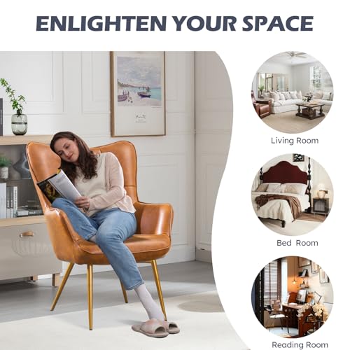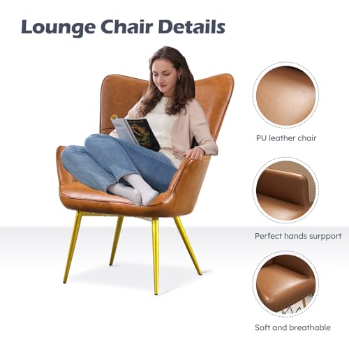 Simore Faux Leather Living Room Chair,Comfy Upholstered Accent Chairs Set of 2 with Golden Metal Legs and High Back,Modern Small Vanity Armchair for Bedroom/Home Office/Study,Light Brown