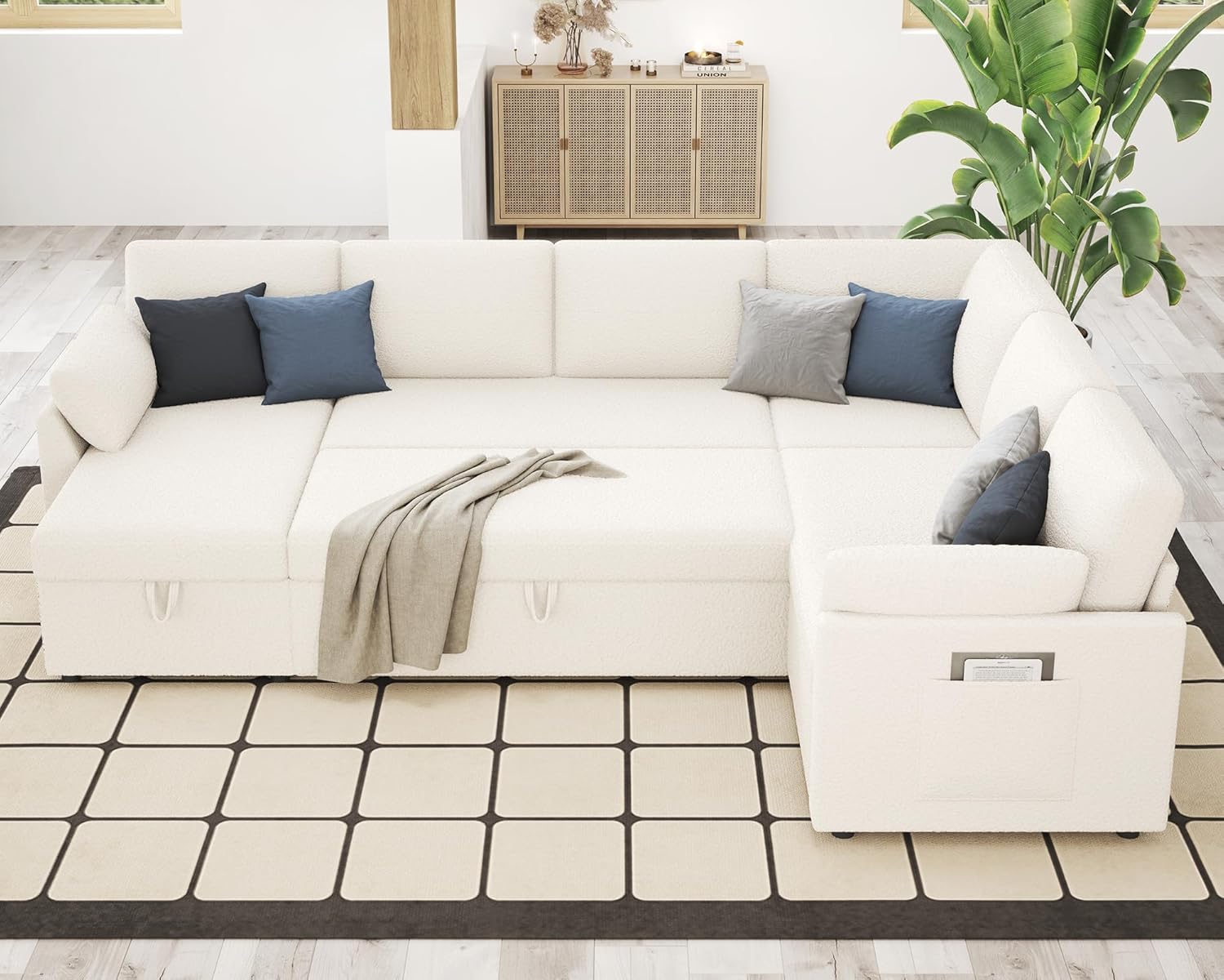 Sleeper Sofa, 112 Inch Pull Out Sofa Bed with Storage Chaise & 3 Seater, Oversized U Shape Sectional Couch with Pull Out Bed, White Boucle Couch, GFDJDGHJ179