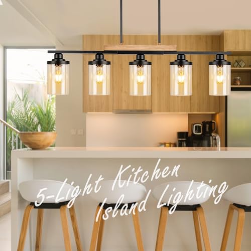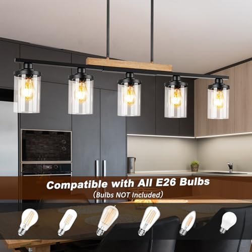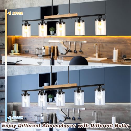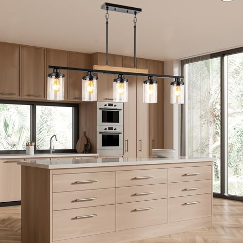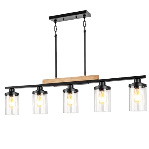 5-Light Kitchen Island Lighting, Farmhouse Dining Room Chandelier over Table, Modern Pendant Light Fixture with Adjustable Height, Large Black Ceiling Light for Dining Table Sloped Ceiling Compatible