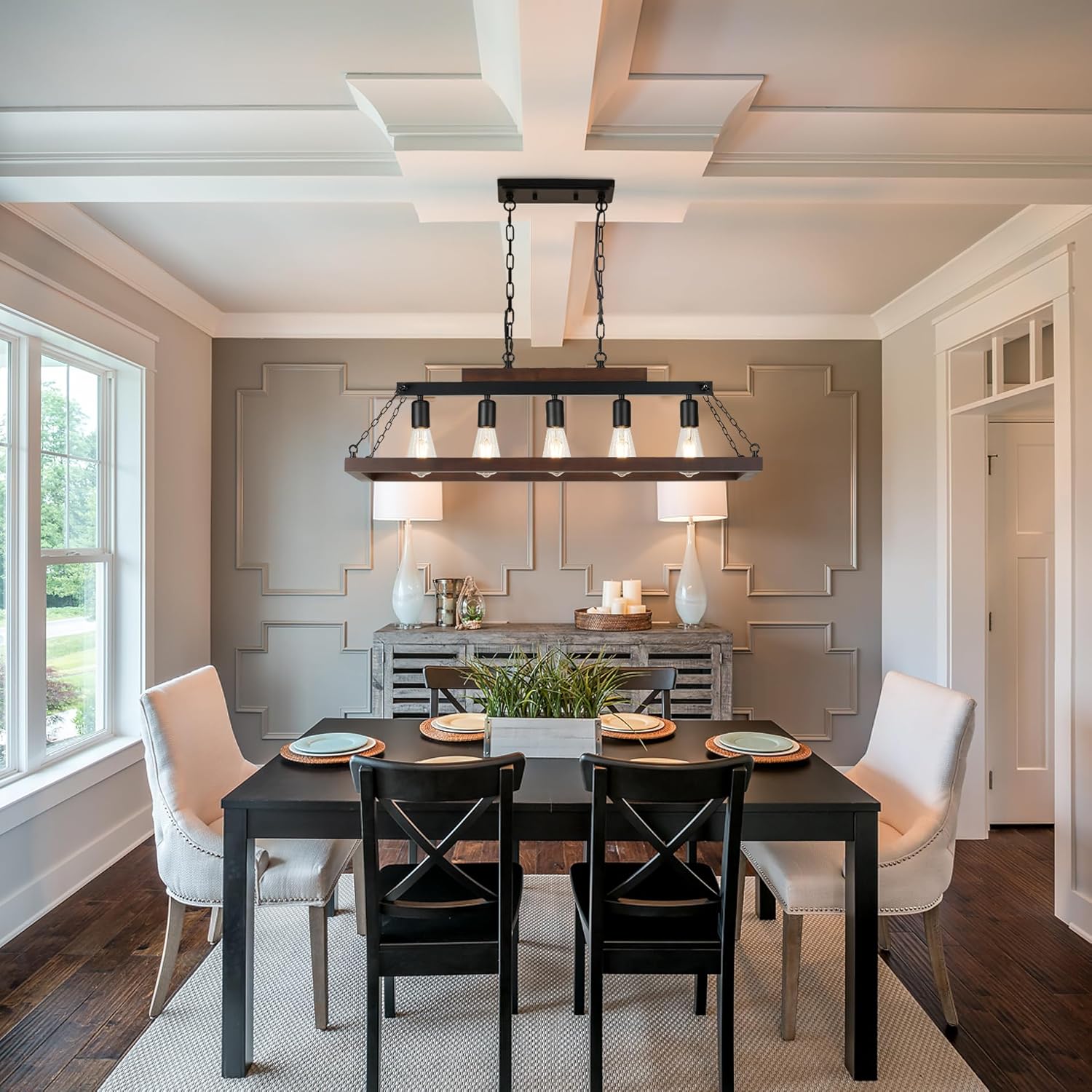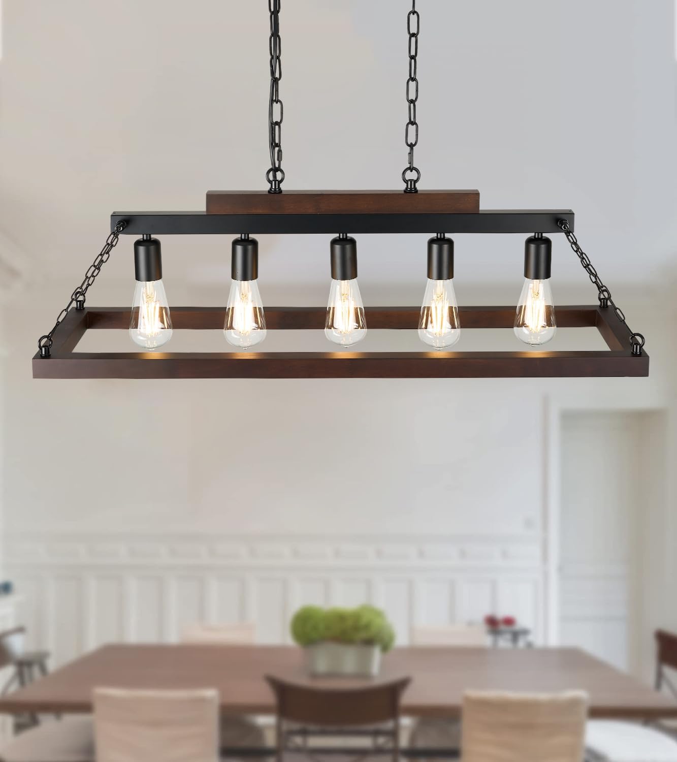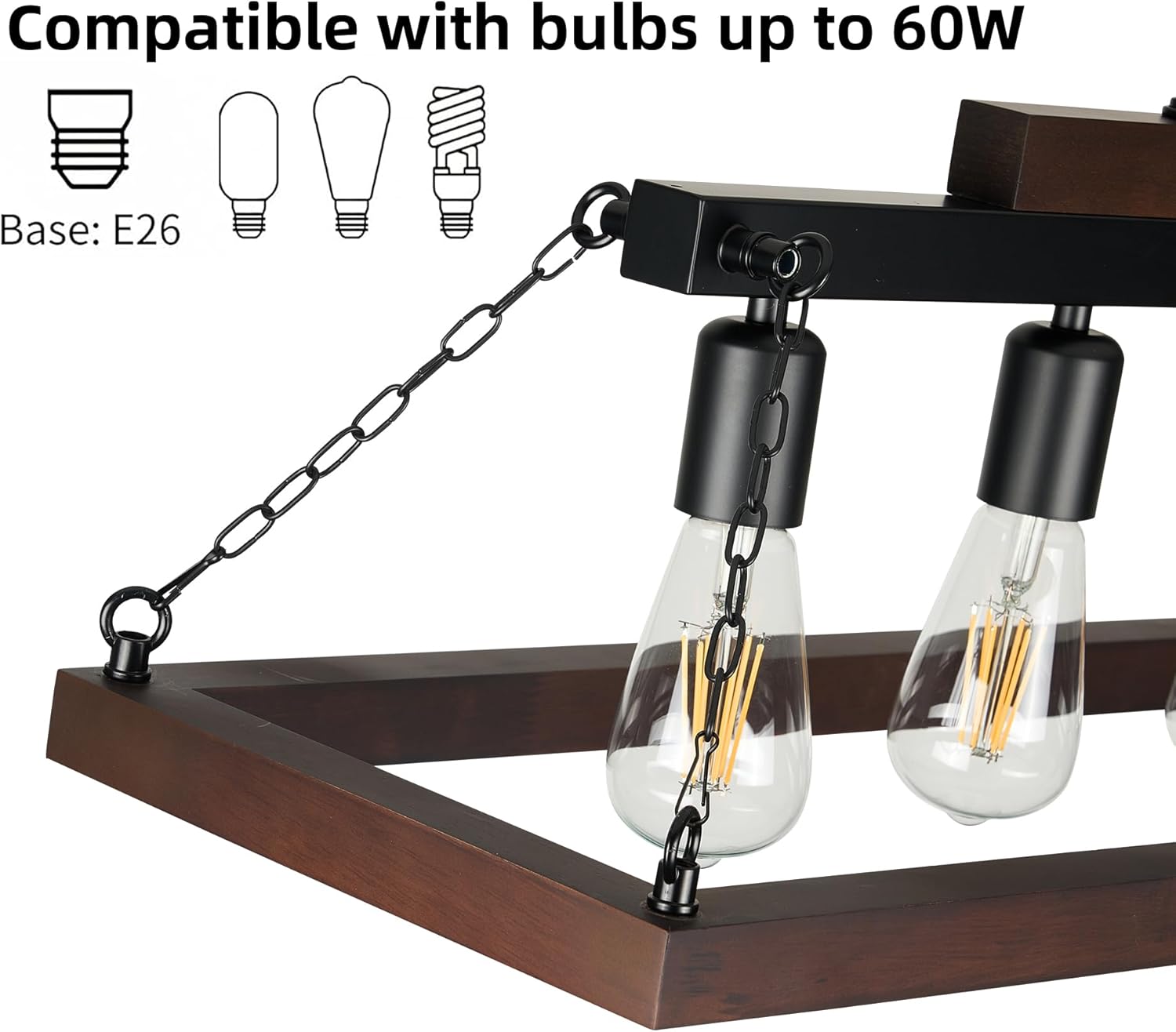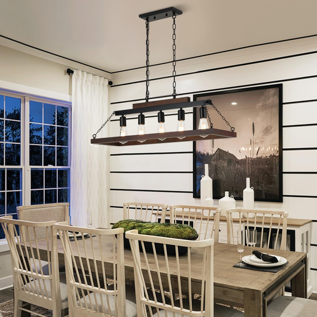 Rustic Rectangular Wood Chandelier for Dining Room Farmhouse Lighting Fixtures Ceiling Hanging Pendant Light Fixture over Table above Kitchen Island Retro Style with Matte Black Industrial Metal Chain