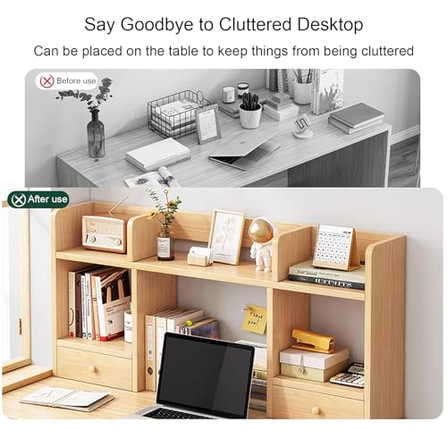 Desktop Book Shelf, Wood Dorm Desk Bookshelf, Desk Organizer Shelves with Drawers, Desk Shelf Organizer Top of Desk, for Home Office Dorm
