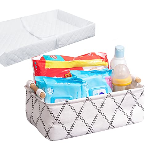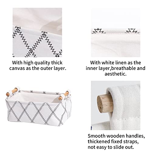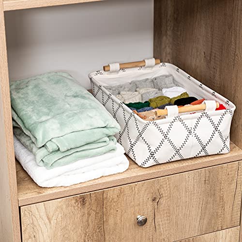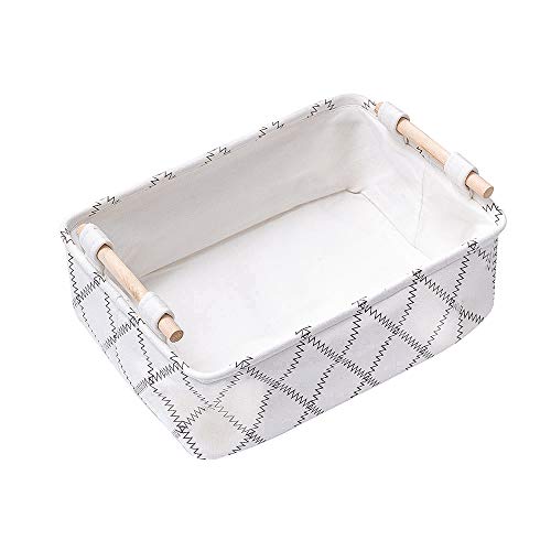 Decorative Collapsible Rectangular Fabric Storage Bin Organizer Basket with Wooden Handles for Clothes Storage, 11"×7.1"×3.9", White