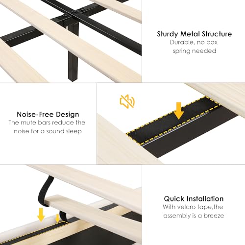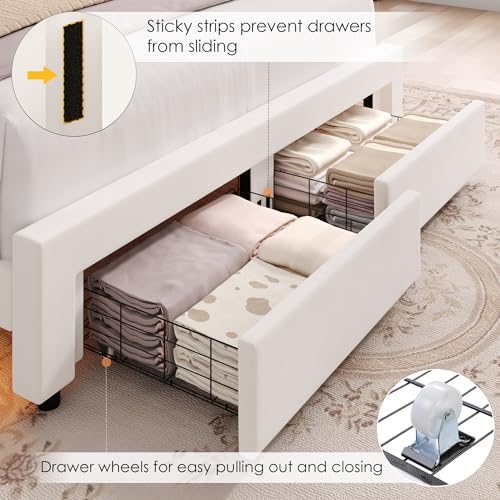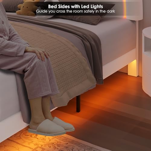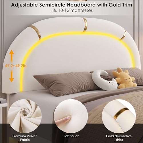 Keyluv Queen Upholstered LED Bed Frame with 2 Storage Drawers and Adjustable Semicircle Headboard, Smart Platform Bed Frame with Golden Trim, Wooden Slats Support, Box Spring Optional, Velvet, Beige