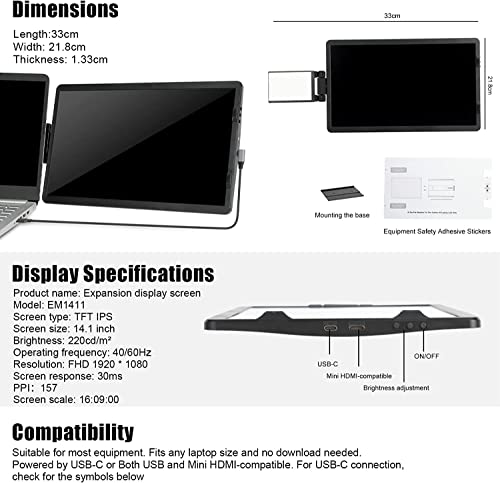 14inch Laptop Screen Extender - 360° Rotatable Attachable Portable Monitor for Laptop TFT USB Laptop Dual Screen, Plug and Play for Mac, PC, & Chrome