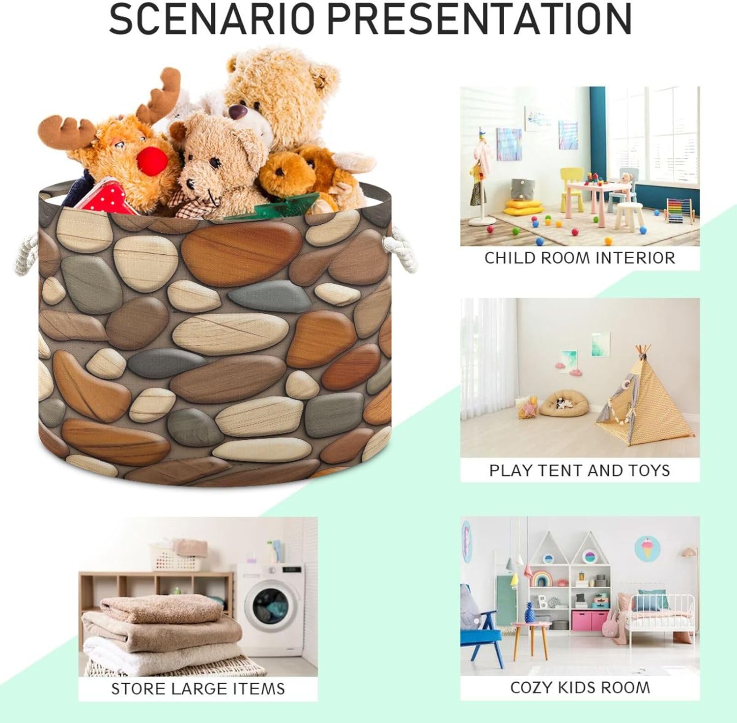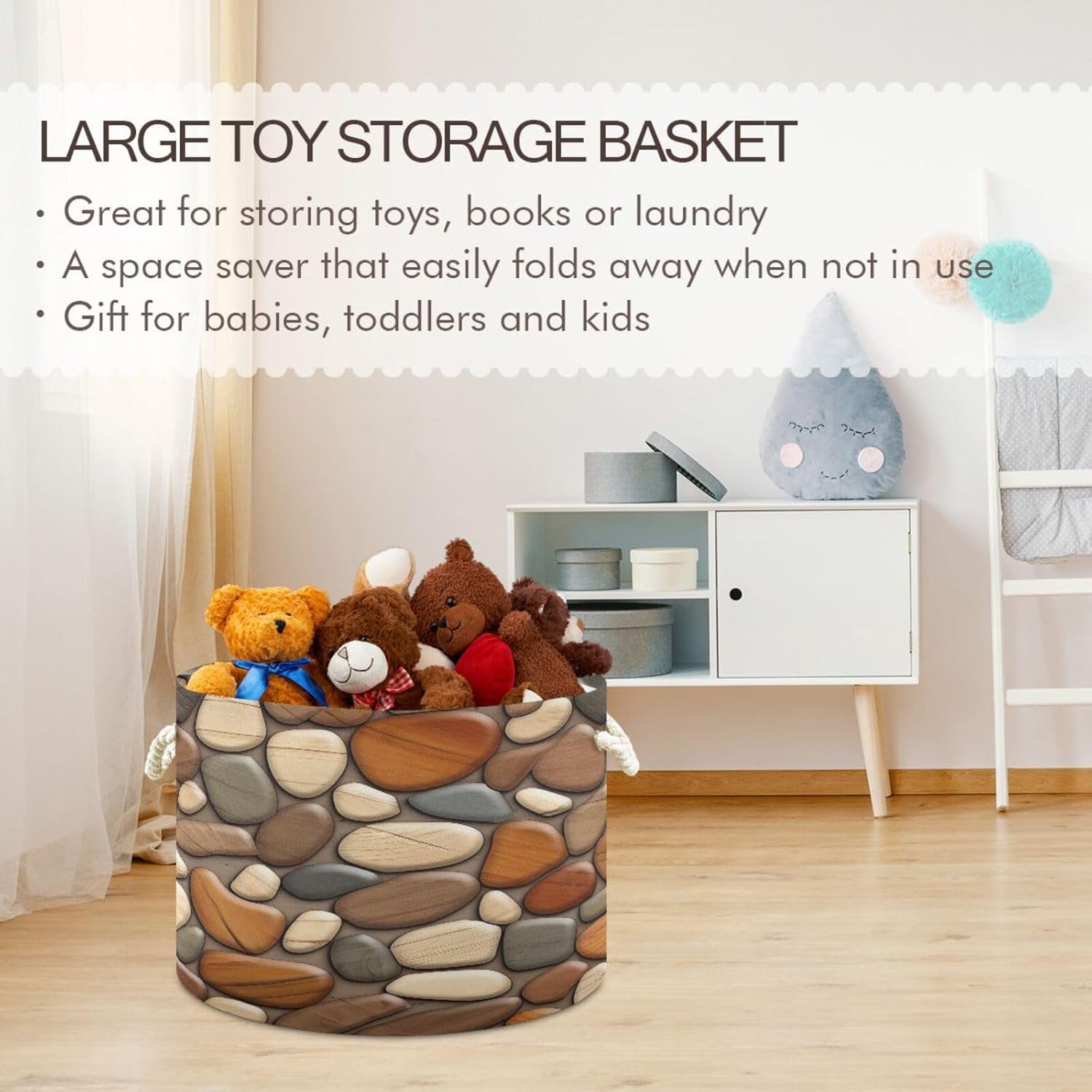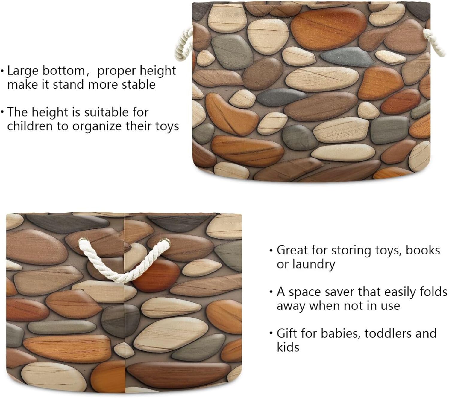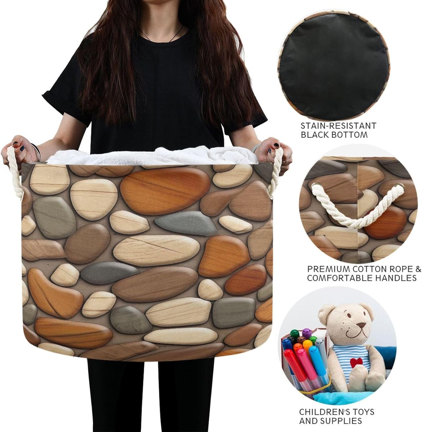 Wooden Stones Texture Extra Large Storage Basket Decorative Laundry Basket with Handles, Rope Basket for Clothes, Blanket, Towel, 20 x 14 Inch