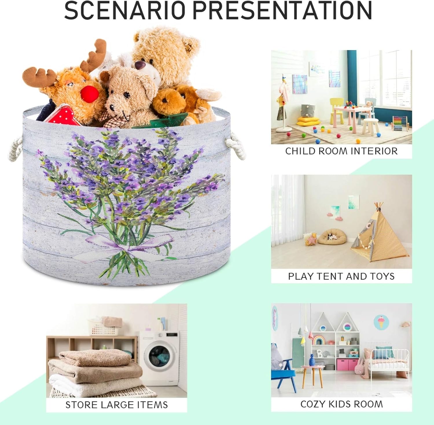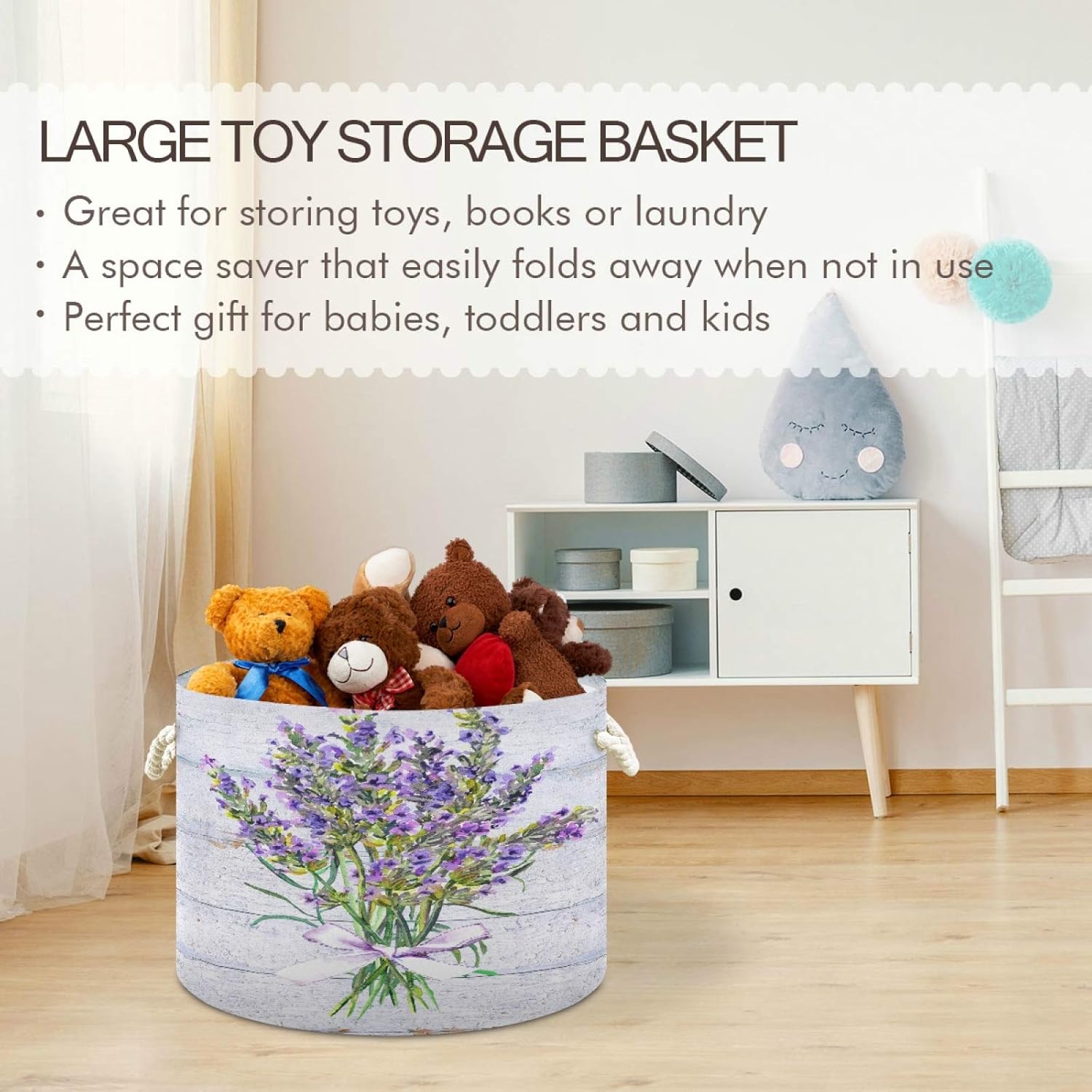 ALAZA Large Storage Basket for Toys Vintage Provencal Lavender Flowers Wooden Round Blanket Basket Baby Laundry Hamper Canvas Organizer Bin Box Cotton Rope Collapsible Bucket Pillow Home Decor