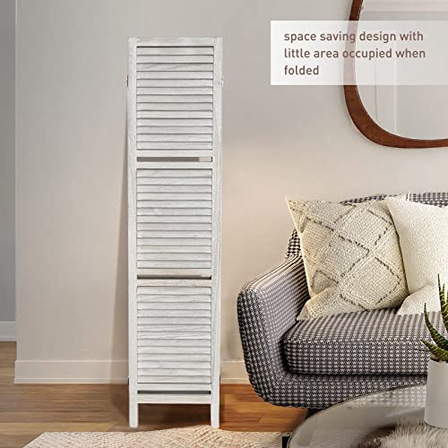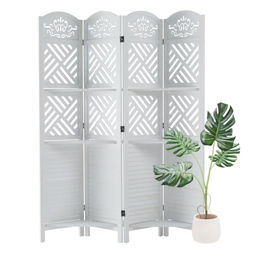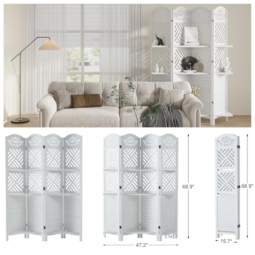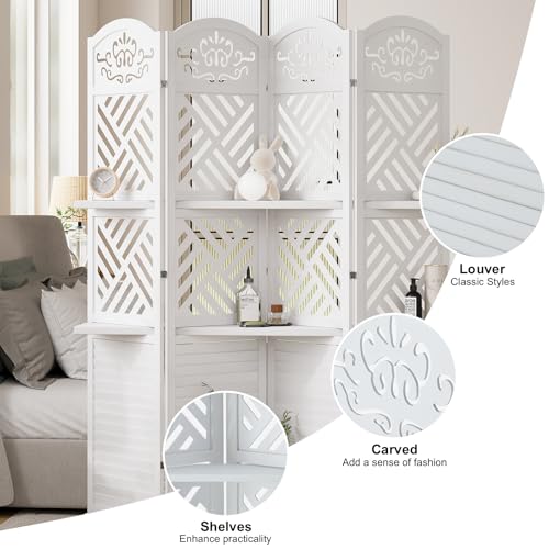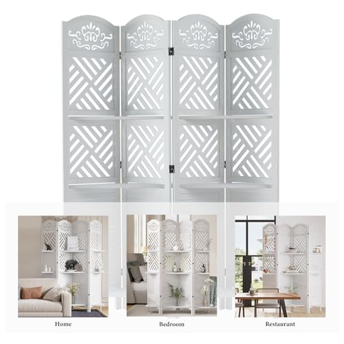 Room Divider with Shelves, 5.75ft Tall Folding Wood Carved Screen with Double Hinges for Home Office Bedroom Hotel Decoration (4 Panels, Pure White)