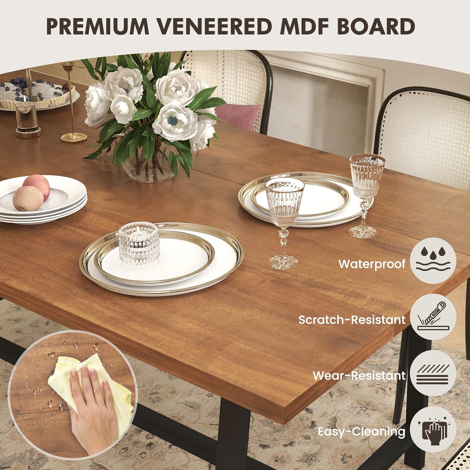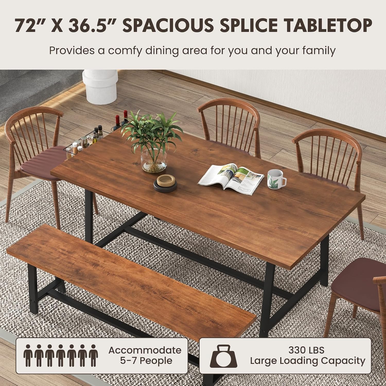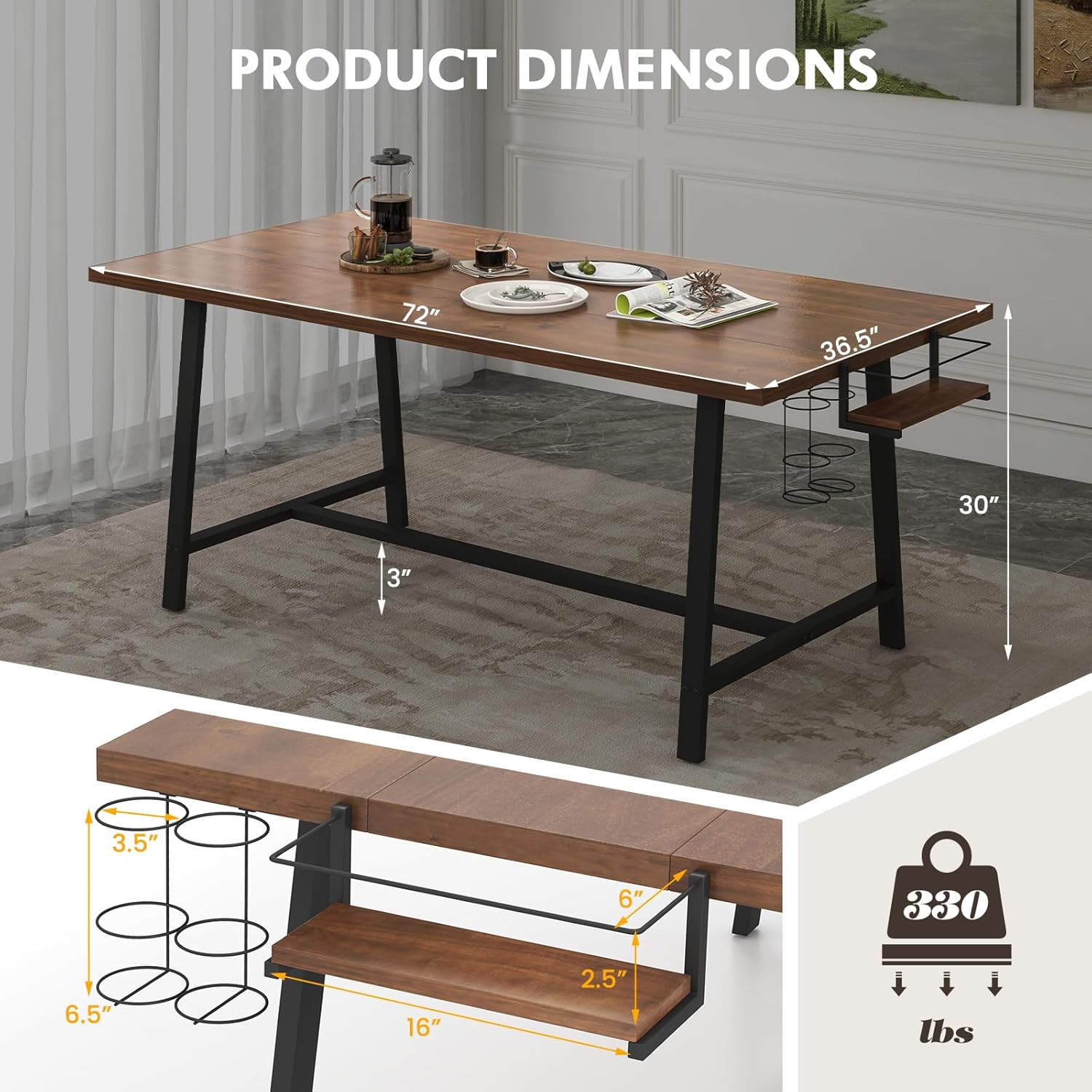 72” Dining Table for 5-7 Person, Rectangular Wood Dining Table with Heavy-duty Metal Frame, Wine Rack & Condiment Holder, Farmhouse Kitchen Table for Family Gathering, Dining Room & Living Room