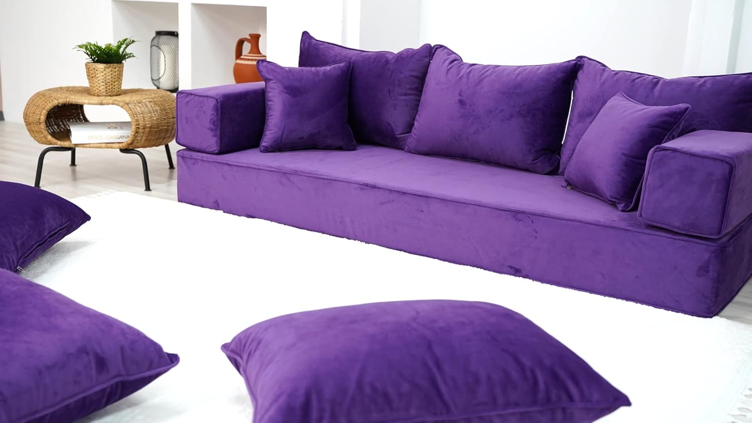 Velvet Floor Seating, Purple Color Floor Sofa, Velvet Floor Couch, Floor Cushions, Sectional Sofa, French Cushions, Fon Cushion, Window Seat (Sofa + Pillows, 8'' Thickness Sofa)