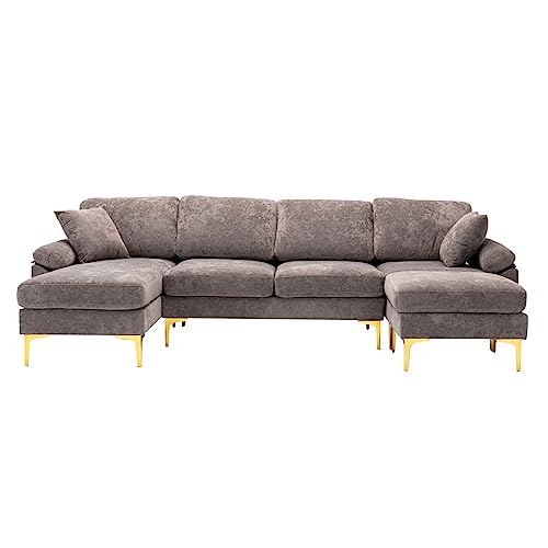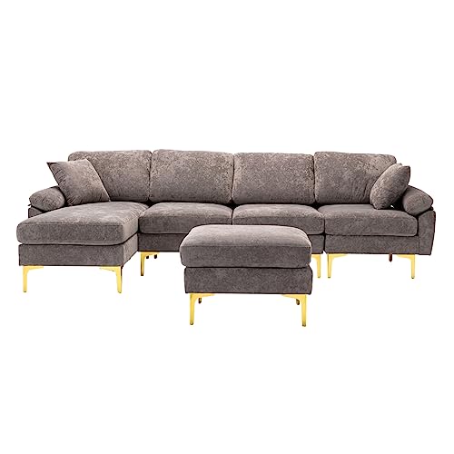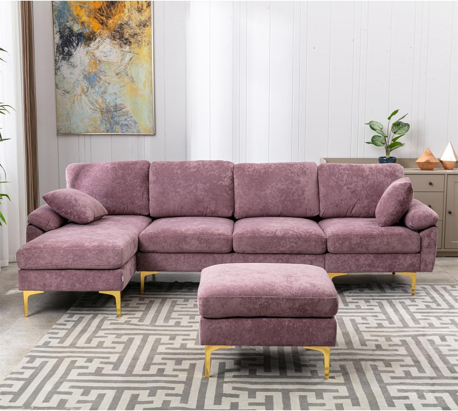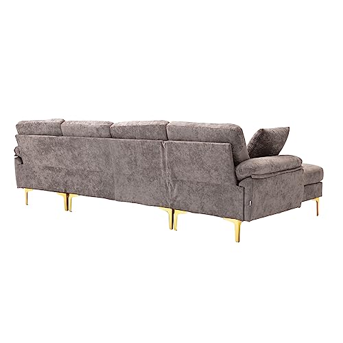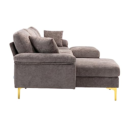Convertible Sectional Sofa with Ottoman, Polyester Fabric L-Shaped Couch with Golden Metal Legs, Modular Sectional Couch Sets for Living Room, Apartment, Purple