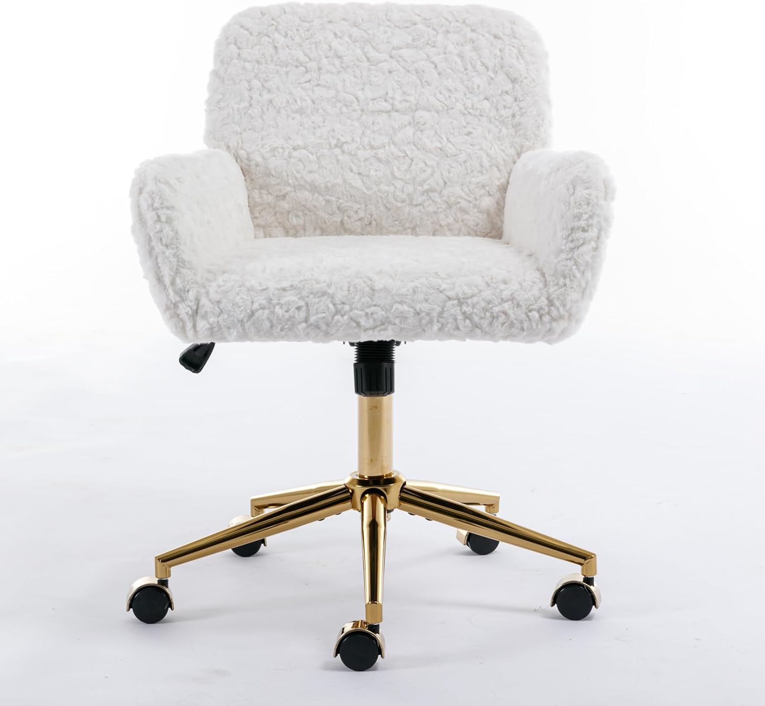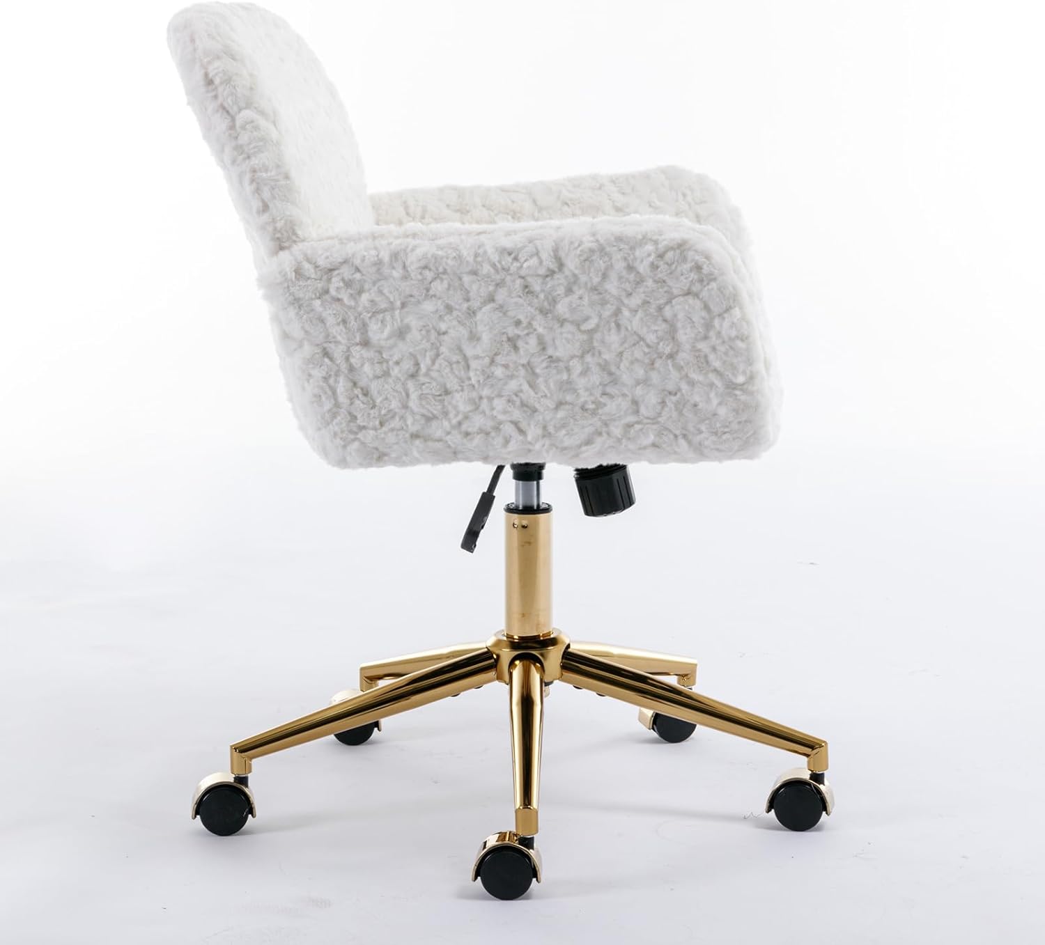 Faux Fur White and Gold Fluffy Desk Chair, Cute Furry Makeup Vanity Chair with Wheels, White Dressing Table Chair, Adjustable Swivel Furry Office Chair for Dressing Room and Bedroom, White