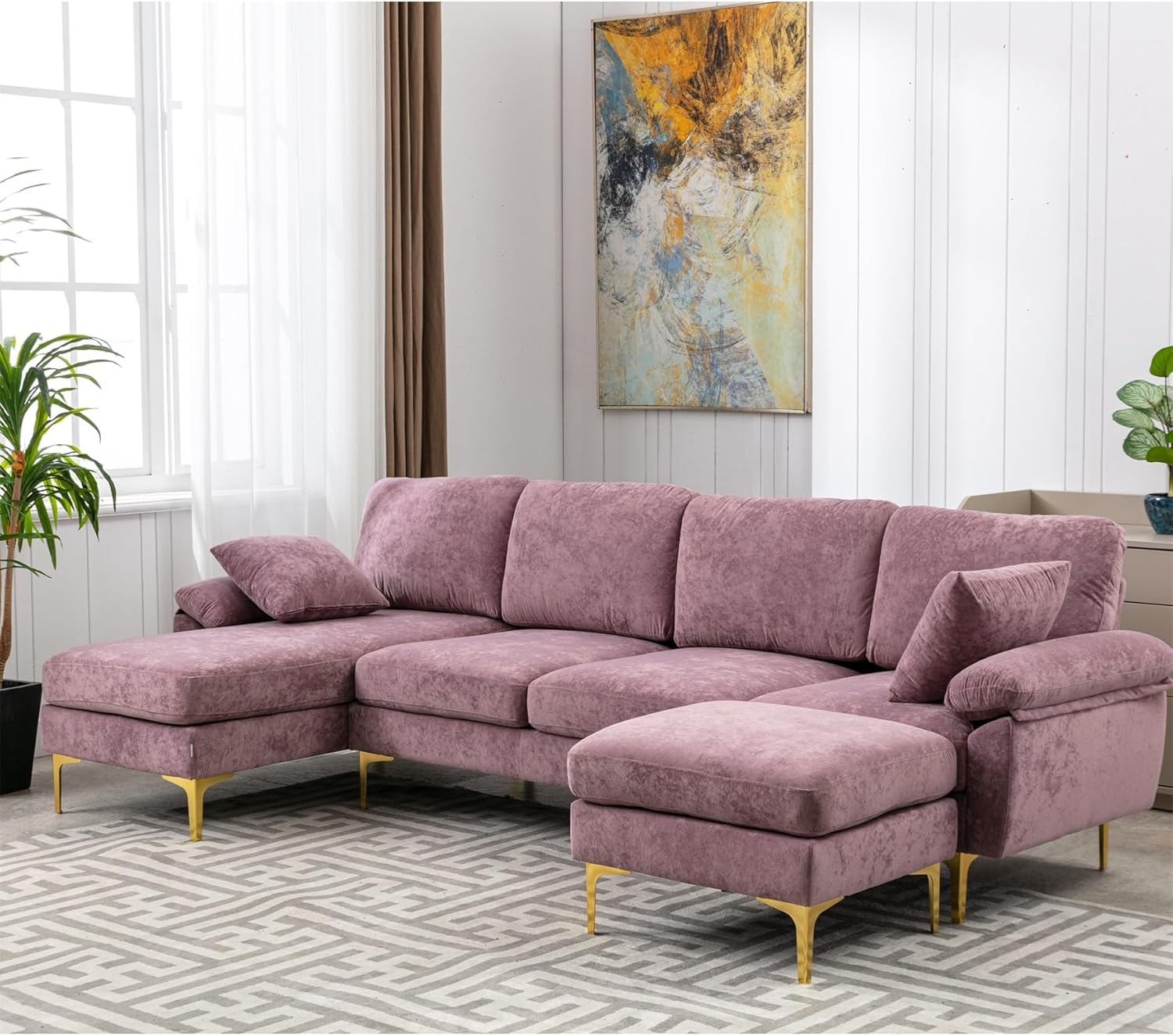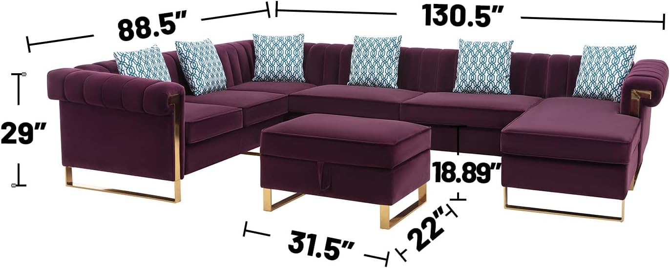 Velvet Upholstered 7-Seater Sectional Sofa with Reversible Chaise, Purple