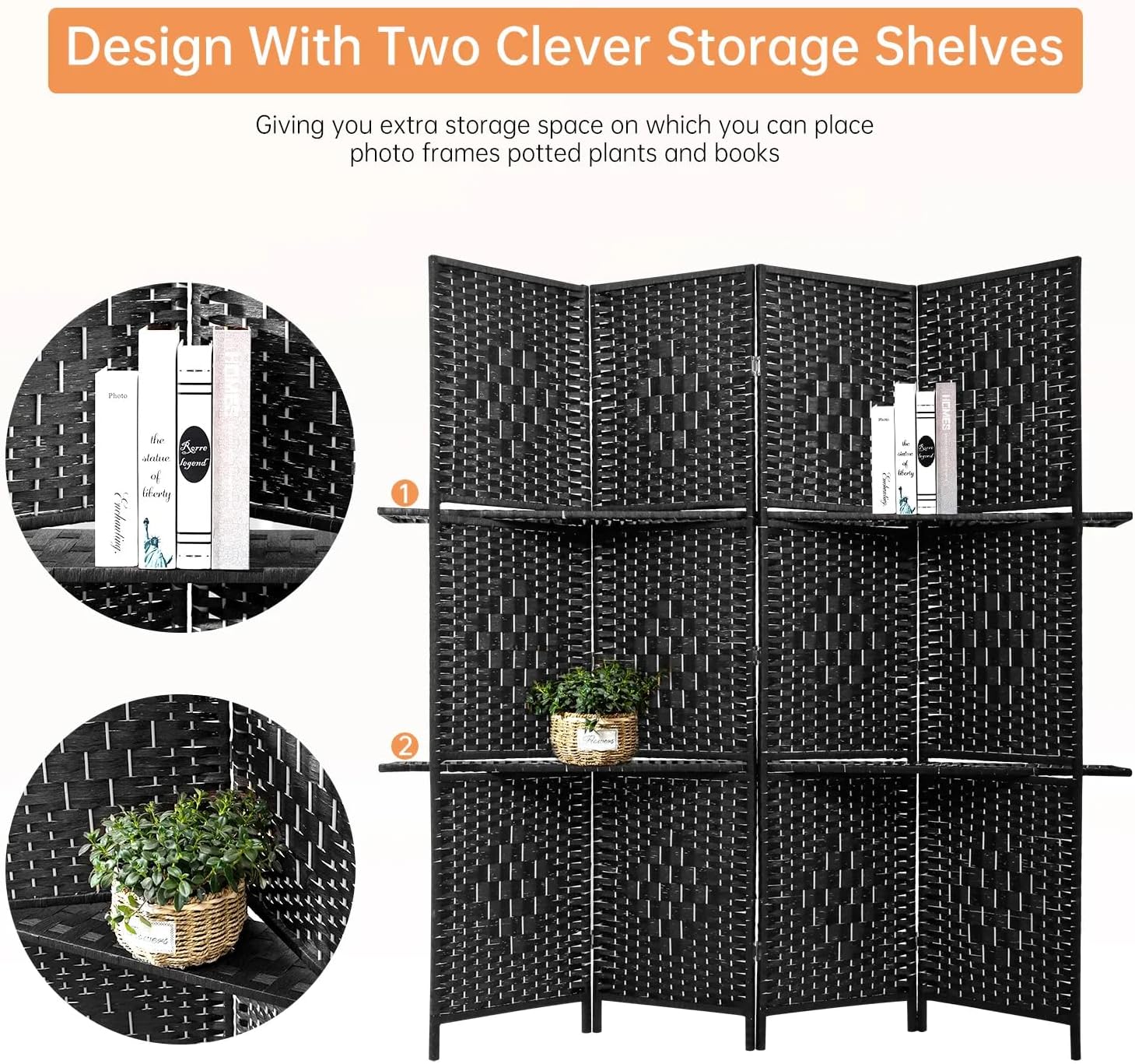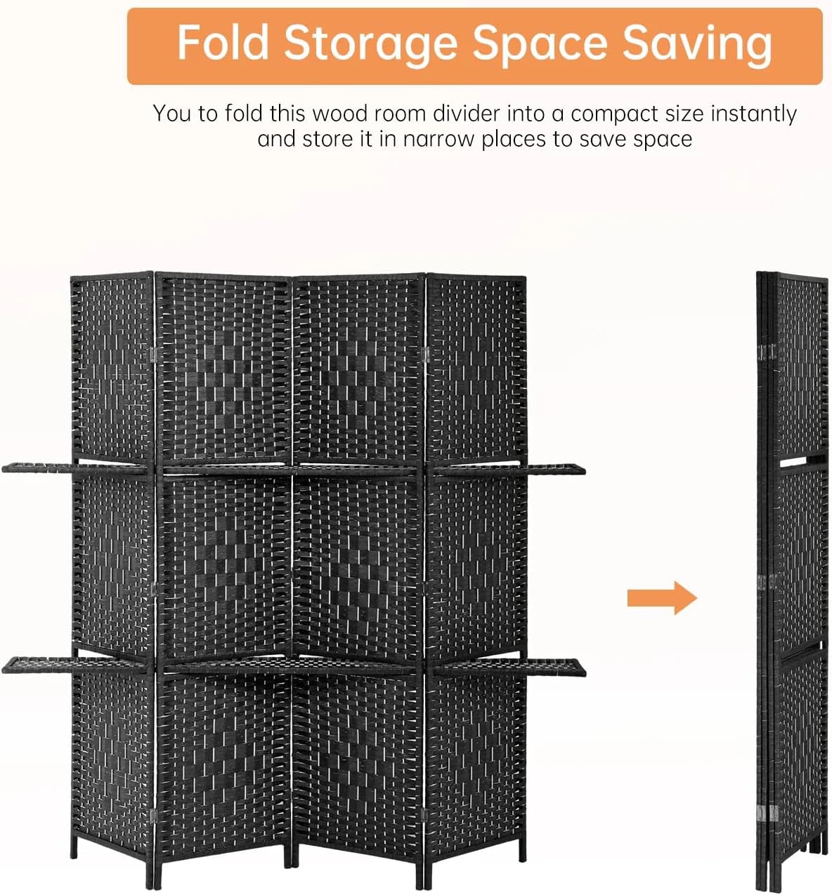 Room Divider 4 Panel Wooden Partition Room Dividers and Folding Privacy Screens, Room Divider Wall with Removable Storage Shelves for Home Office Bedroom Restaurant (Black)
