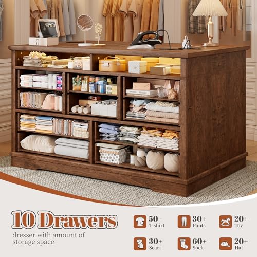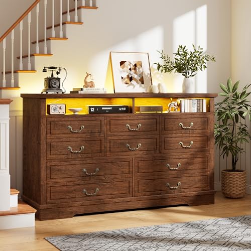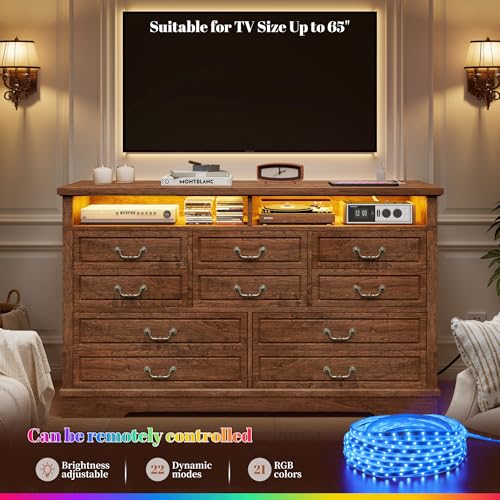 EnHomee Farmhouse Dresser for Bedroom 55.2''W Wood Dresser with LED & Power Outlet Vintage 10 Drawer Dressers & Chests of Drawers Long Dresser TV Stand, Hallway, Dark Rustic Oak