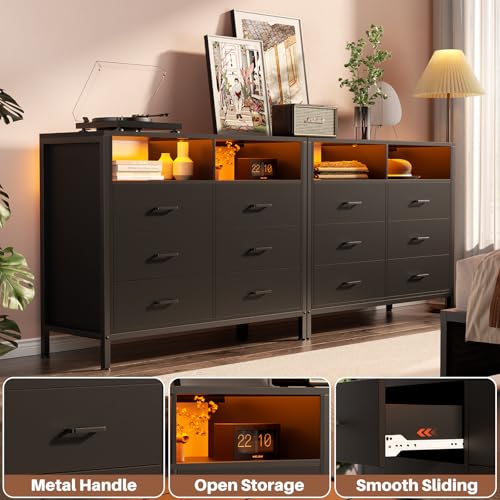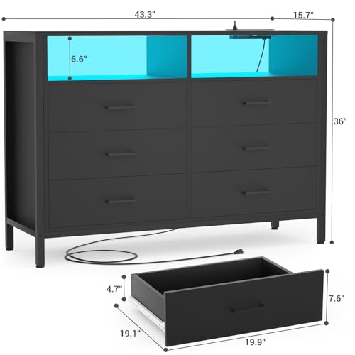 White Dresser for Bedroom, 6 Drawer Dresser with LED Lights and Charging Station, Wood Dresser, Tall Chest of Drawer Storage Organizer, Dresser TV Stand for Living Room, Hallway, Entryway