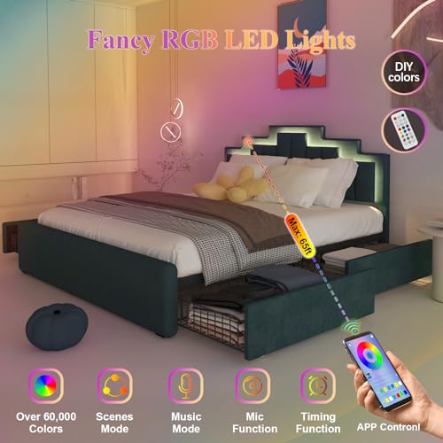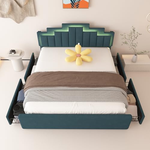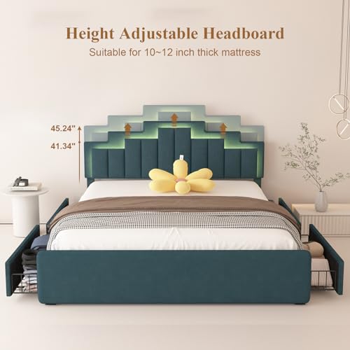 Full Size Bed Frame, Upholstered LED Bed Frame with 4 Storage Drawers, Platform Bed with Adjustable Headboard, Solid Wooden Slats Support, No Box Spring Needed, Grey