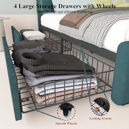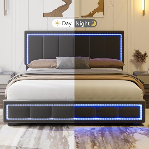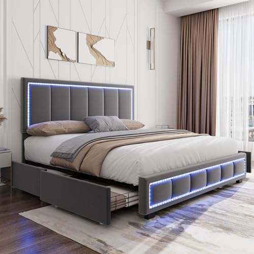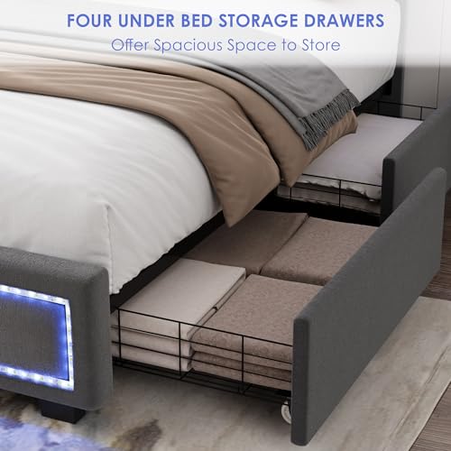 Queen Size Bed Frame with 4 Storage Drawers, Upholstered Platform Bed with LED Light and Adjustable Headboard, Wooden Slats Support, No Box Spring Needed, Light Luxury Design,Grey