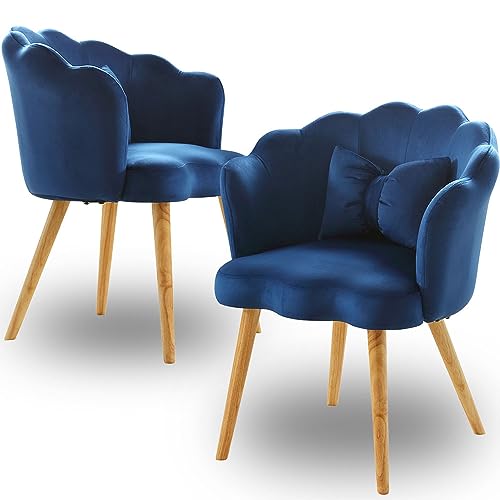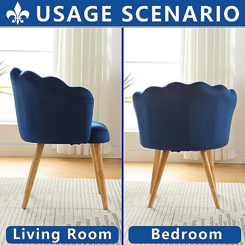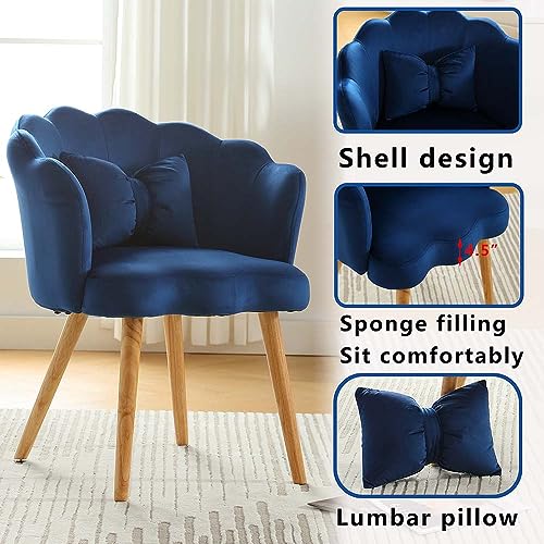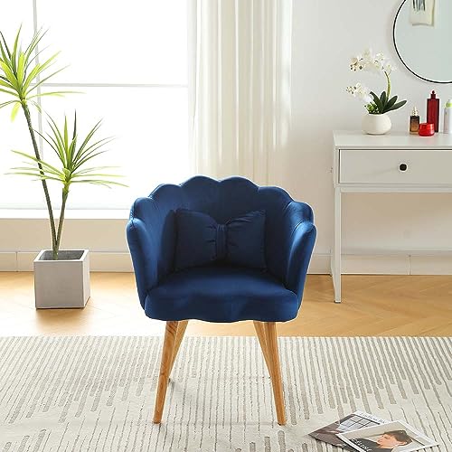 Modern Velvet Accent Chair,Shell Shape Upholstered Armchair with Wood Legs,Comfy Reading Chair for Bedroom,Living Room,Makeup Room,Bowknot Pillow (Blue)