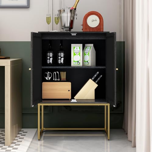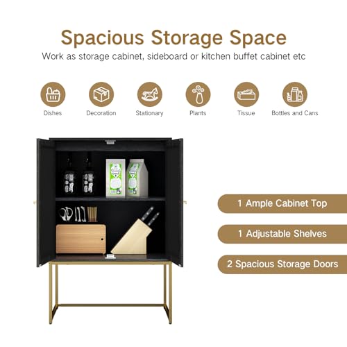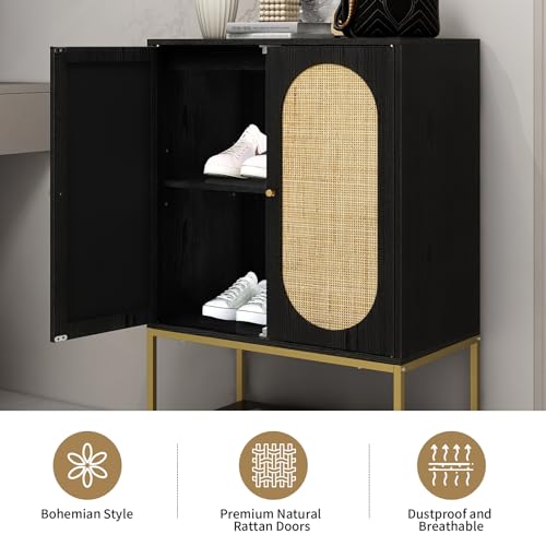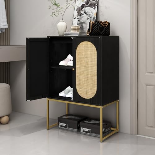 Natural Rattan 2 Door High Cabinet, Sideboard Buffet Cupboard Accent Cabinet with 1 Adjustable Shelves, Wooden Free Standing Cabinet for Living Room Dining Room (Black)