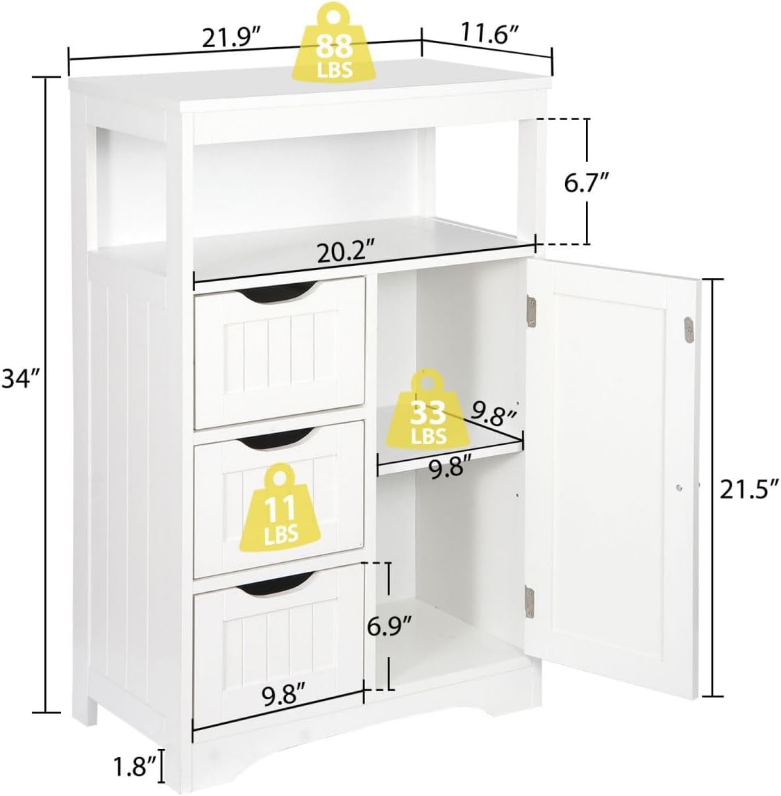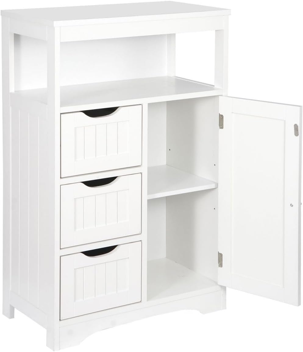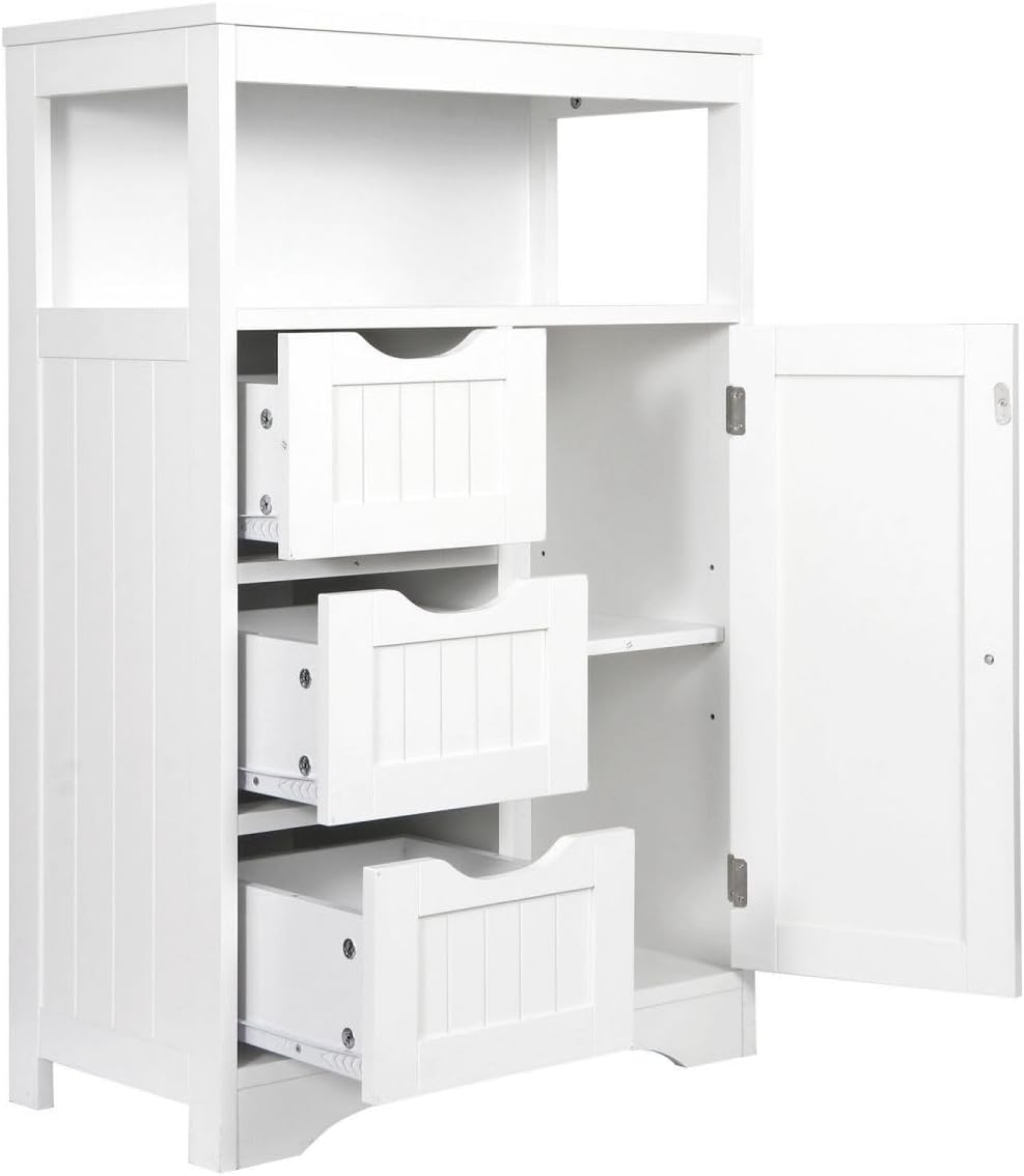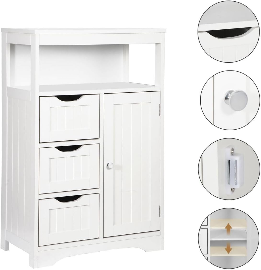 White Bathroom Floor Cabinet Wooden Storage Organizer with 1 Door and 3 Drawers, Free-Standing Cupboard for Kitchen/Living Room/Bathroom Use