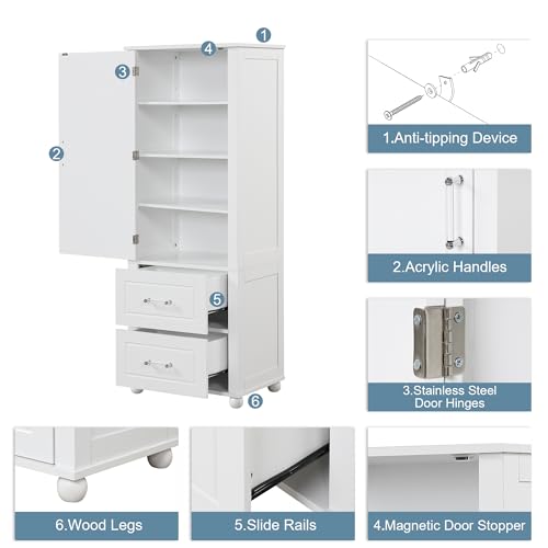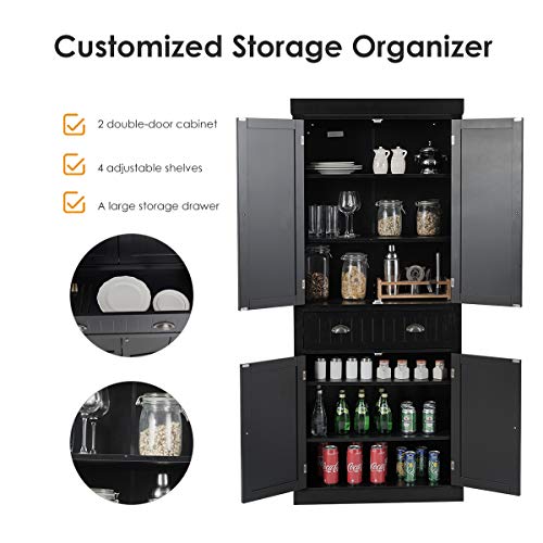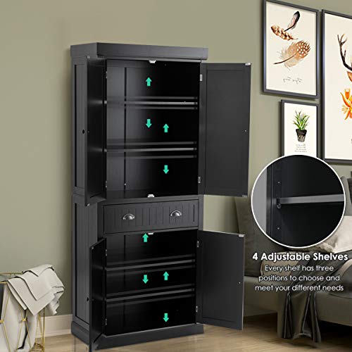 Kitchen Pantry Cupboard Cabinet, Storage Cabinet w/Drawers & Adjustable Shelves, 4-Door Wooden Storage Organizer for Kitchen (White)