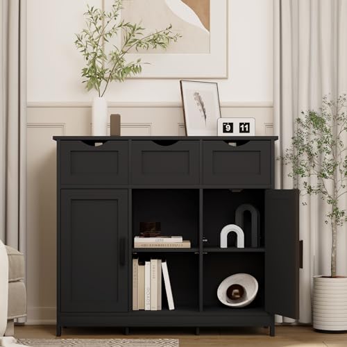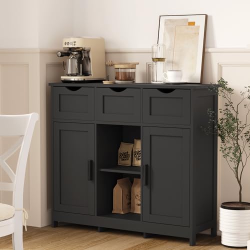 Wooden Bathroom Cabinet, Sideboard Floor Storage Cabinet with 3 Drawers, Open Shelf and 2 Cupboard, Freestanding Coffee Bar Cabinet for Living Room, Bathroom, Kitchen, 35.4"L x 11.8"W x 31.1"H,White