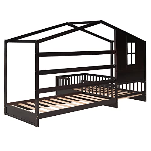 Twin Size L-Shaped Structure House Bed, Bedroom Furniture Pine Wood House Bed Frame with One Full Fence Bed and Decorative Panel at The Back, for Kids & Teens (White)