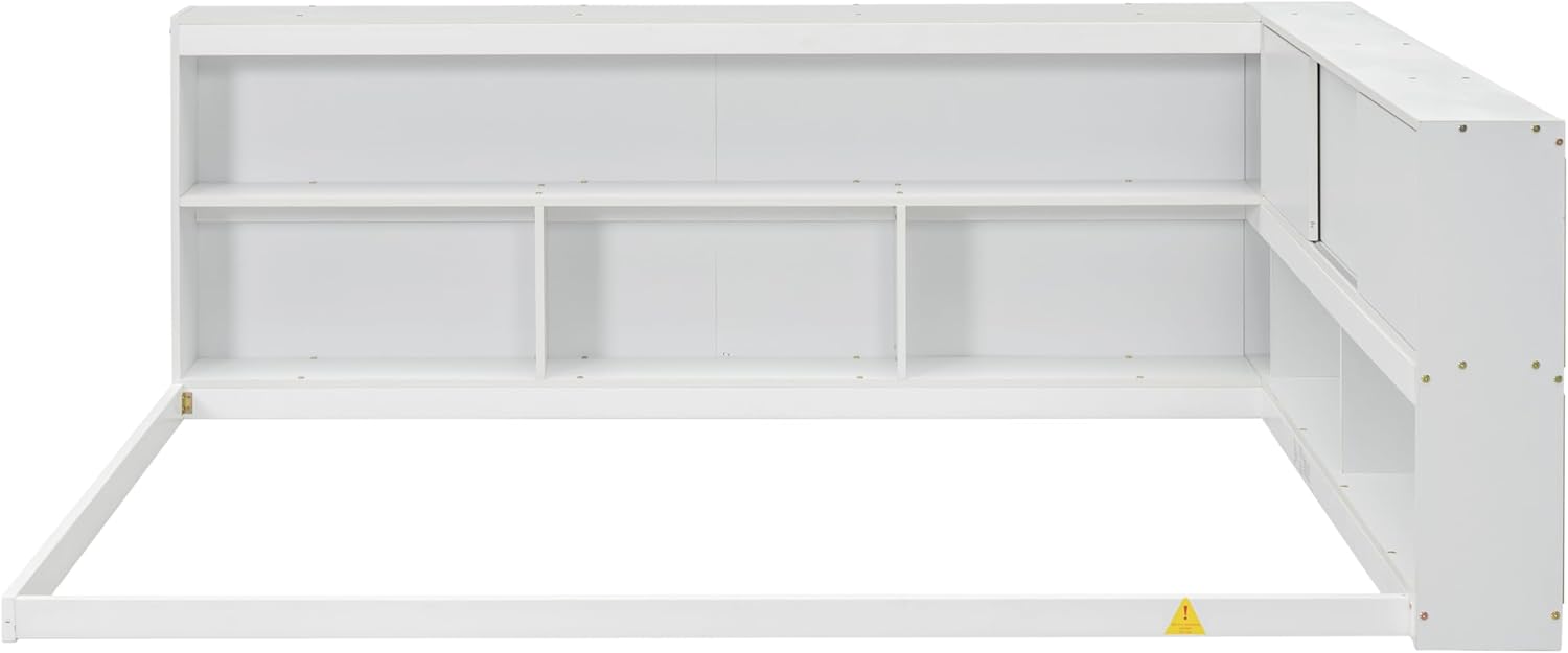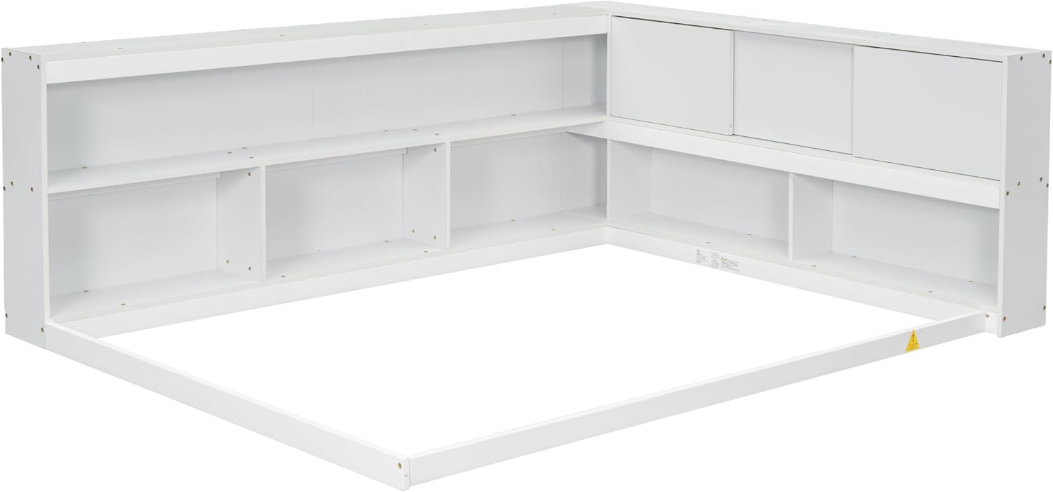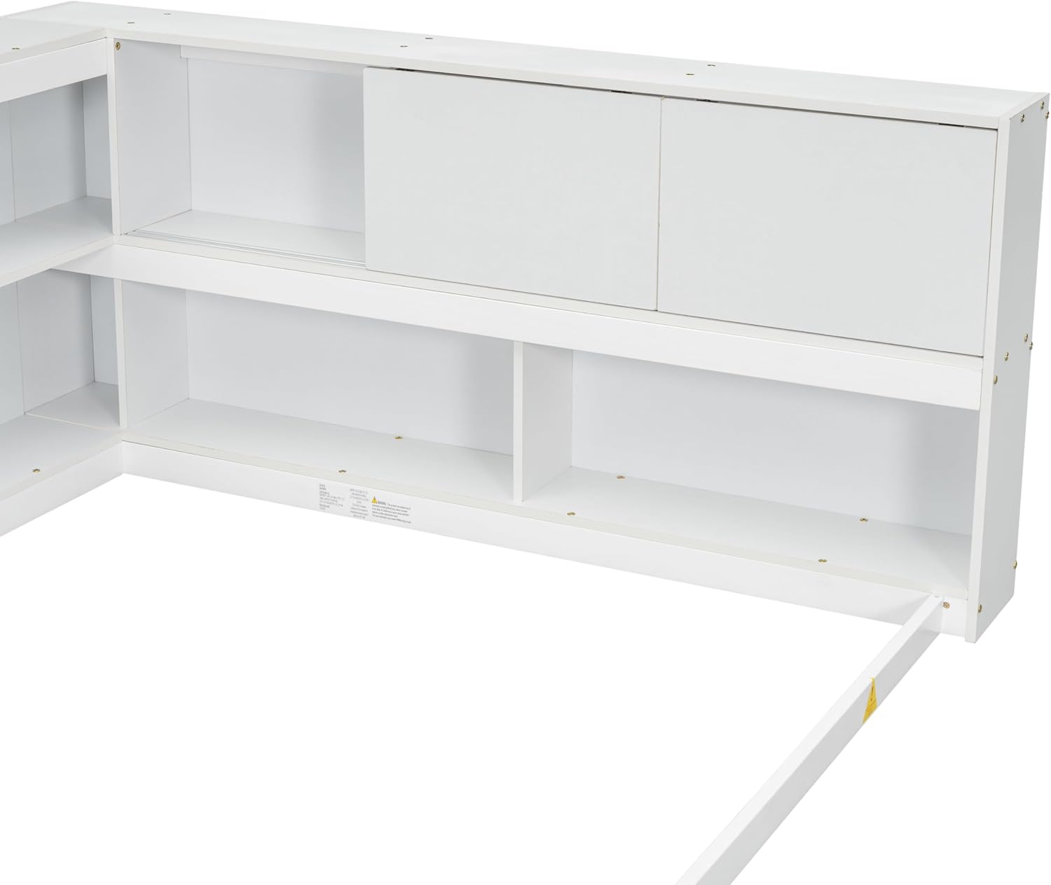 Full Size Floor Bed with L-Shaped Bookcases, Full Bed Frame with Sliding Doors at Headboard for Bedroom Guestroom, Without Slats, White