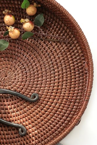 HITOMEN 11.8'' Hand-Woven Round Rattan Serving Tray Decorative Wicker Trays with Handles for Coffee Table (Natural-M)