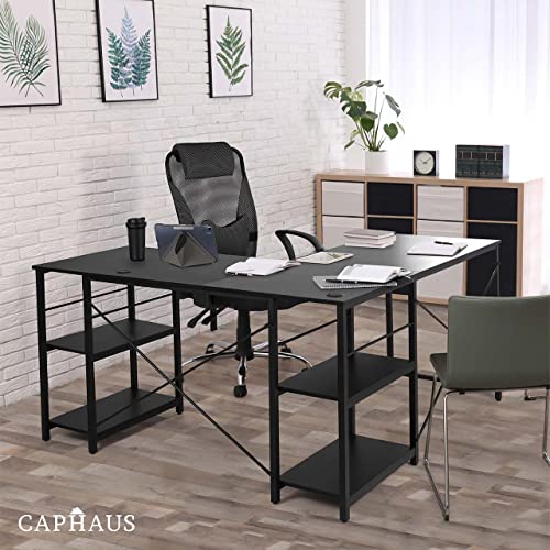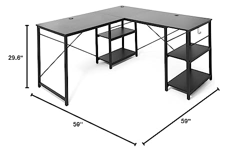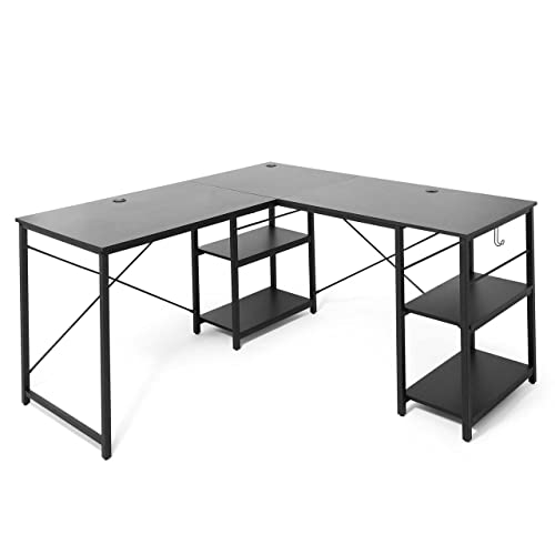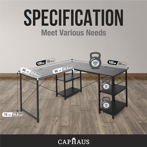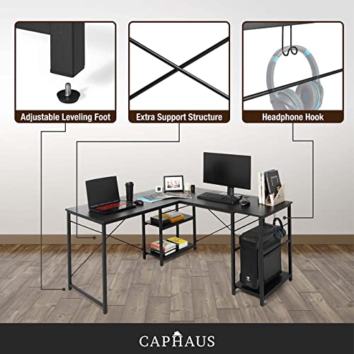 CAPHAUS Computer Desk, 51 Inch L-shaped Home Office Desk with 2-Tier Storage Shelves, Study Writing Corner Desk, Industrial Modern Laptop Workstation with Iron Hook, Rustic Oak and Black P2 Board