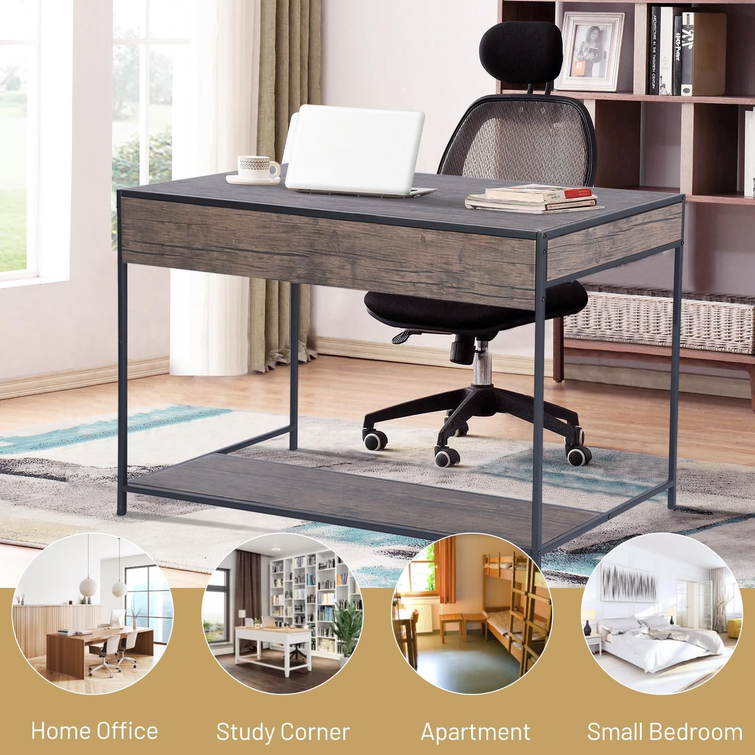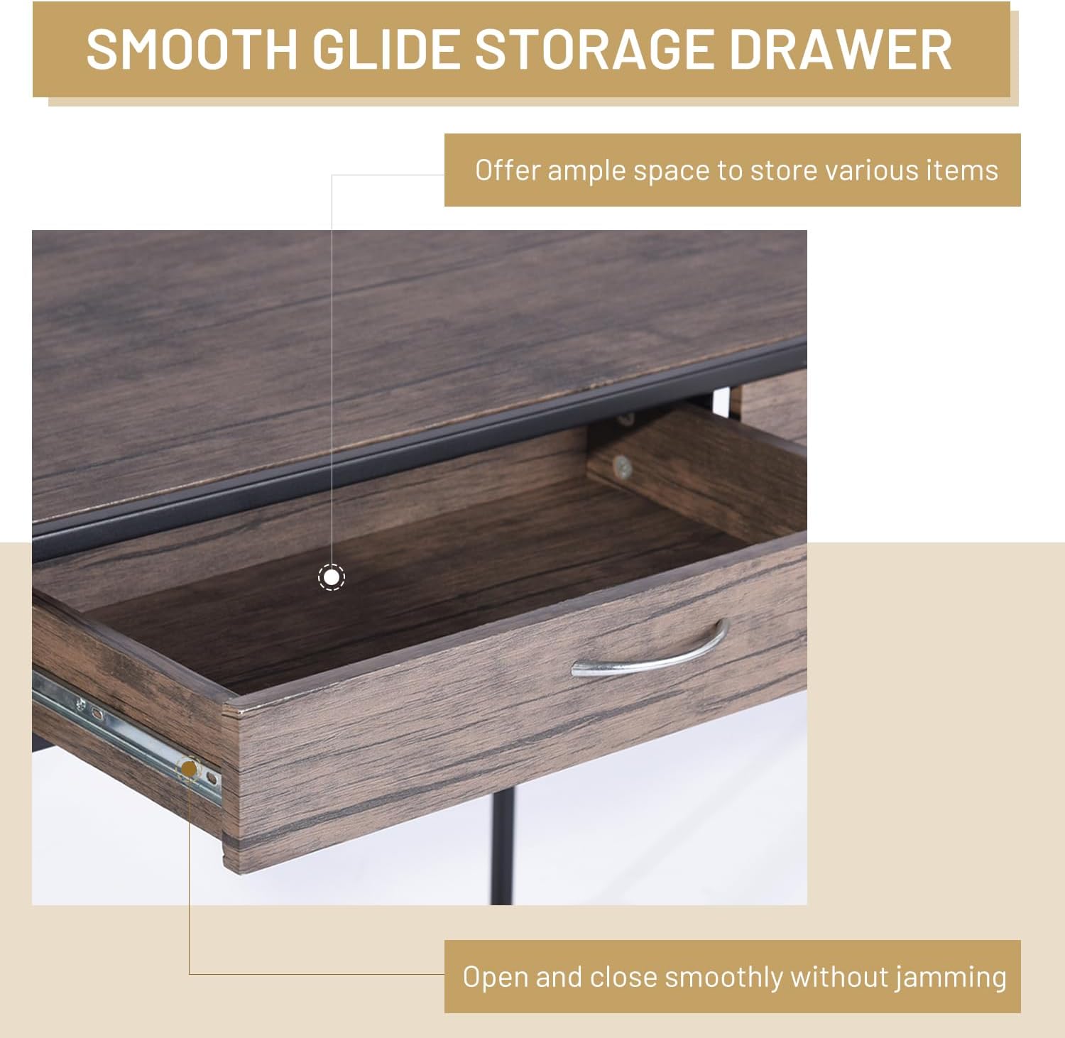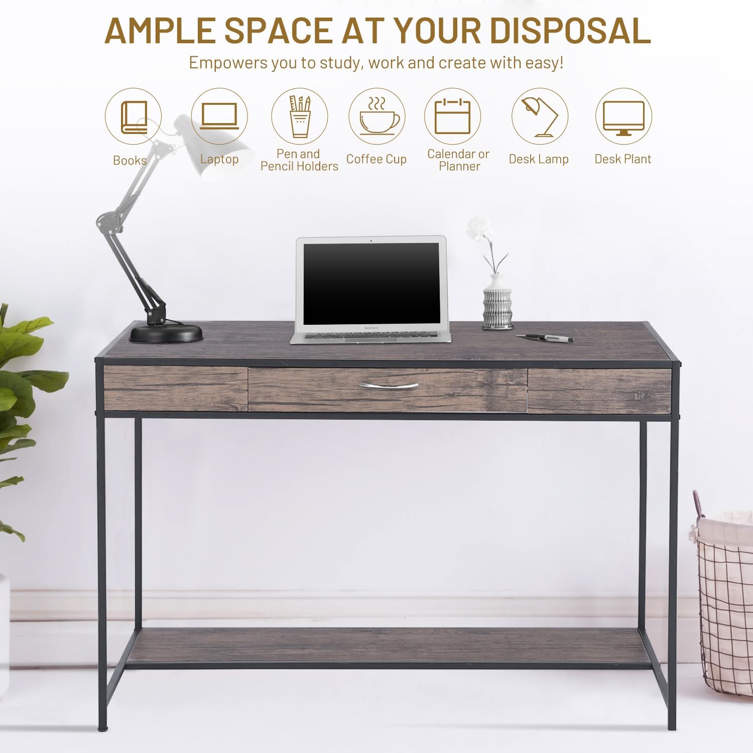 FurnitureR Vintage Wooden Computer Desk with Drawer, 43 Inches Industrial Writing Desk Workstation with Metal Legs and Bottom Shelf for Home Office, Brown