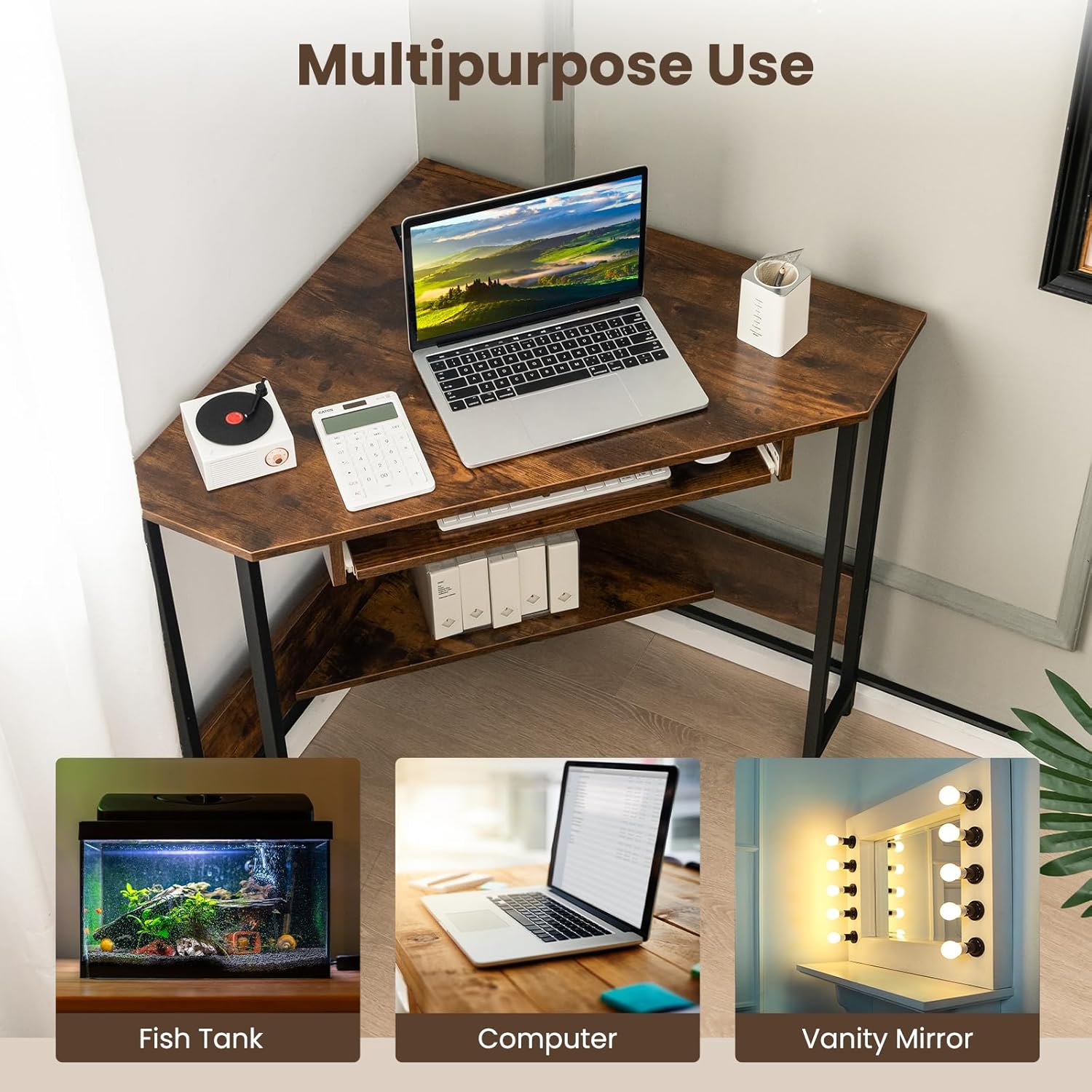 Corner Desk with Outlets & USB Ports, Computer Desk W/Storage Shelf & Keyboard Tray for Small Space, Industrial Small Side Table for Home Office Workstation, Rustic Brown