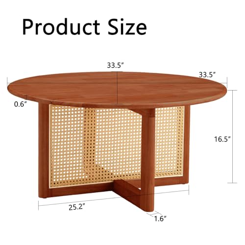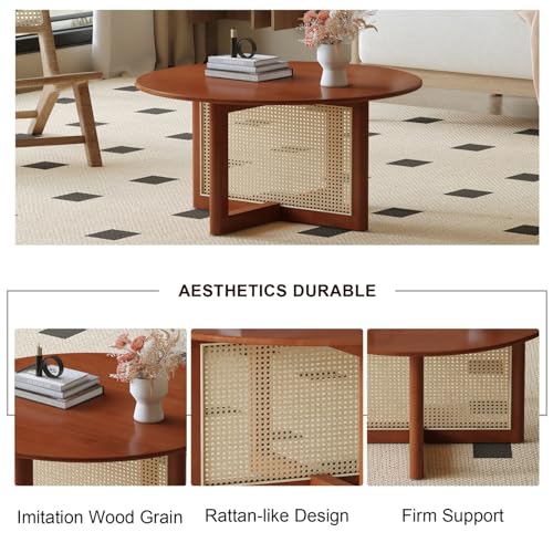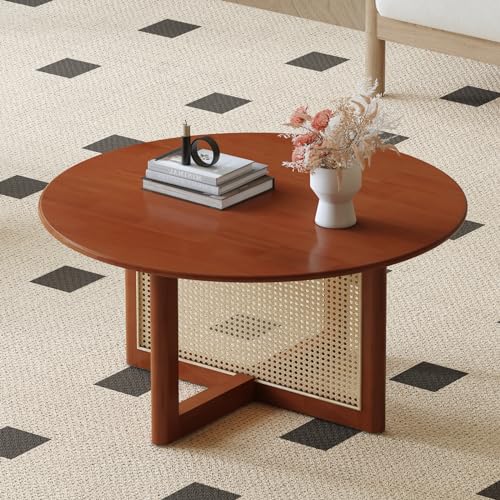 Rattan Coffee Table,Round Rattan Coffee Table,Natural Coffee Table,Boho Solid Wood Coffee Table for Living Room, Bedroom, Office, Apartment (Deep Red)