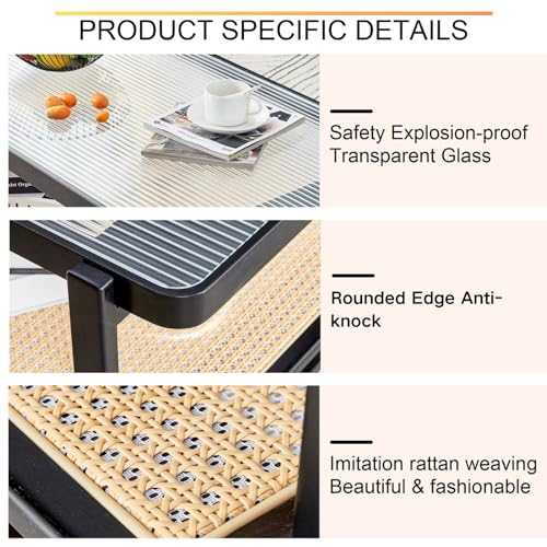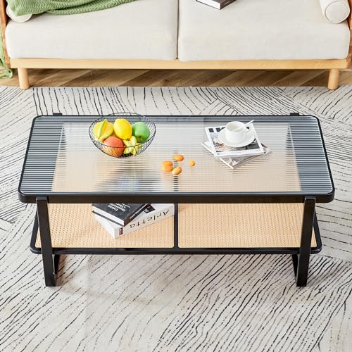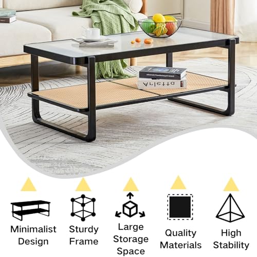 Mid-Century Modern Coffee Table,Tempered Glass Top Round Coffee Tables,Rattan Shelf Supported Storage Tea Table,Solid Wood Frame Coffee Table for Living Room (Round, Natural Color)