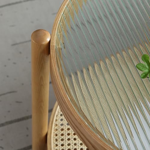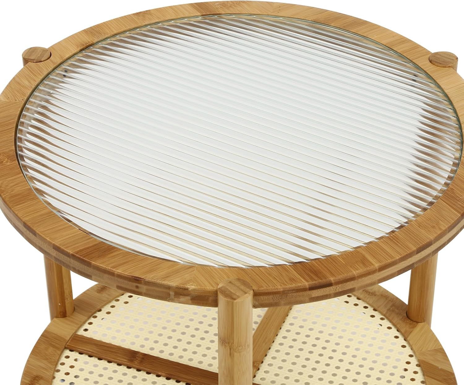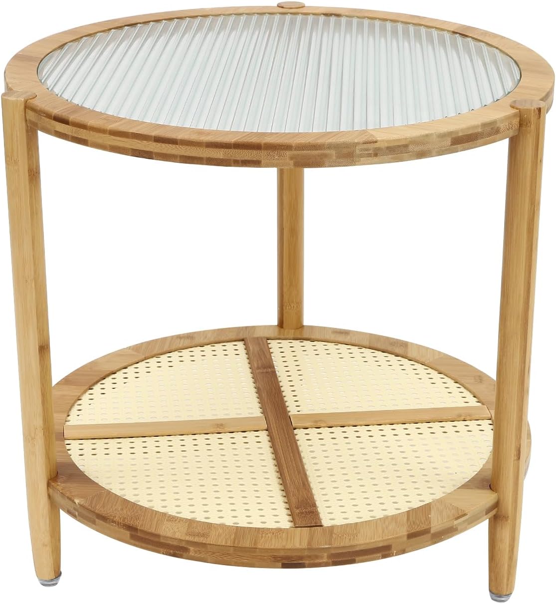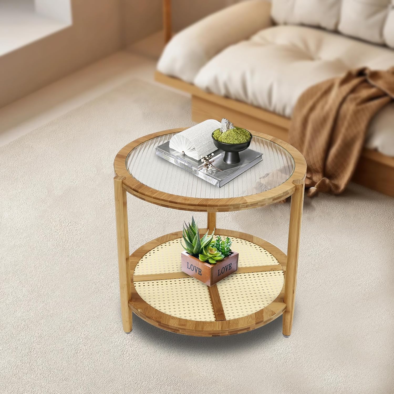 Round Bamboo Side Table, Small Round Side Table with Rattan Shelf 2 Tier Modern Coffee Table Glass Tabletop Accent Table, Indoor Round End Table for Balcony and Office
