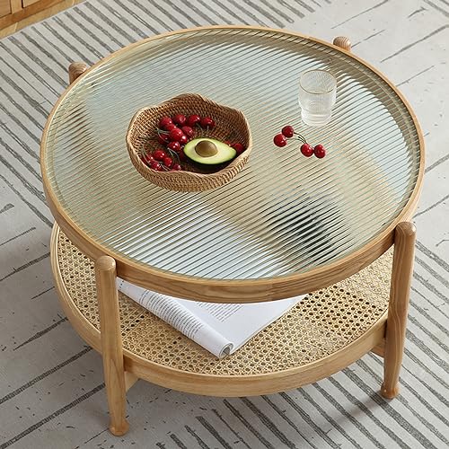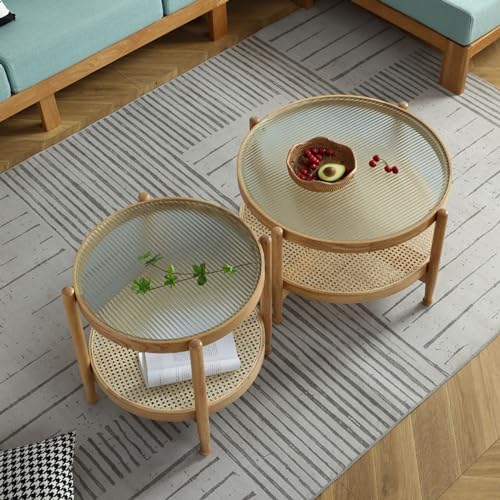Wood Round Coffee Table with Rattan Storage Shelf, 2-Tier Boho Mid Century Modern Glass Top Snack Tea Table Cocktail Table, Sofa Table for Living Room Bedroom (Color : Walnut, Size : 70x70x45cm)