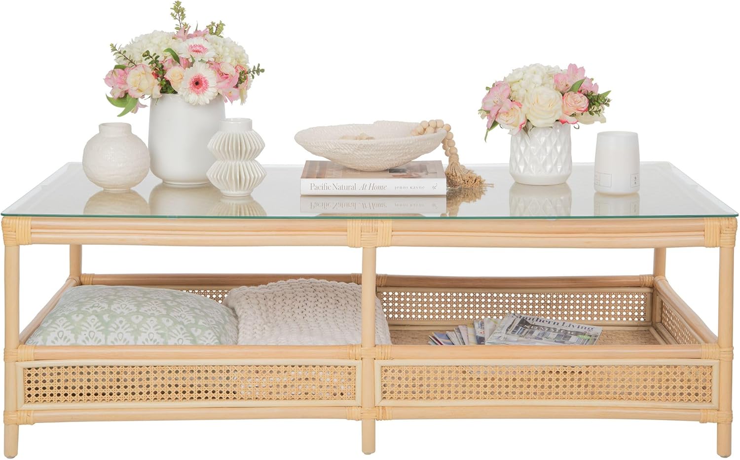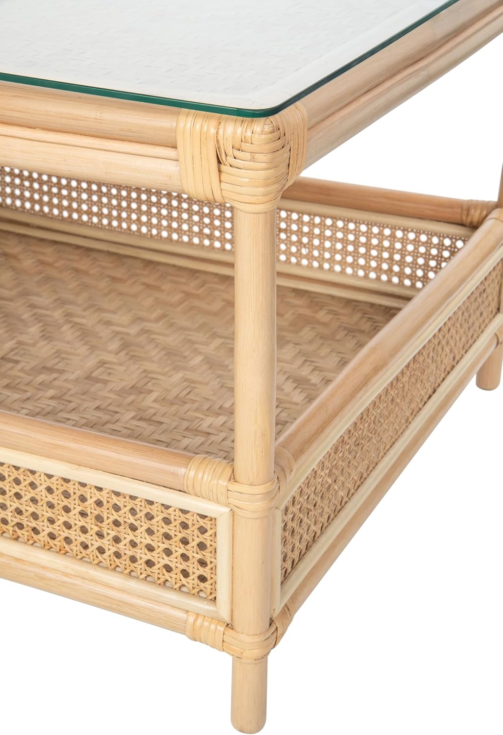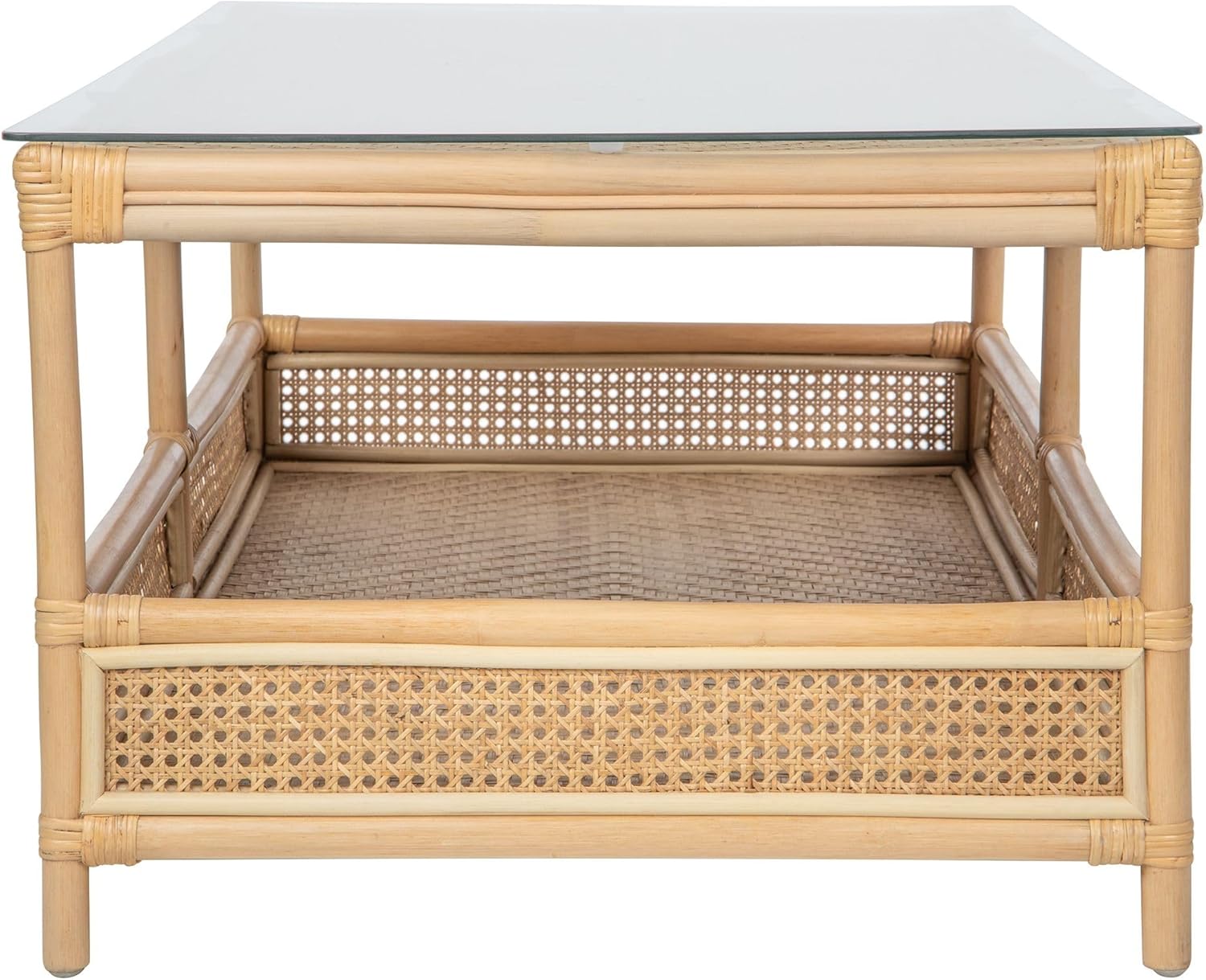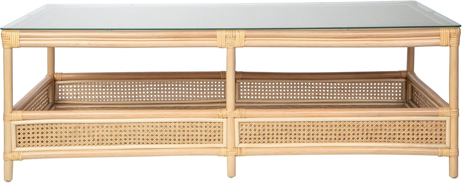 Kouboo Rattan Cane Rectangular 2-Tier Open Shelf Coffee Table with Glass Top, Living Room Table, 52 in. x 23.5 in., Boho Chic Tropical