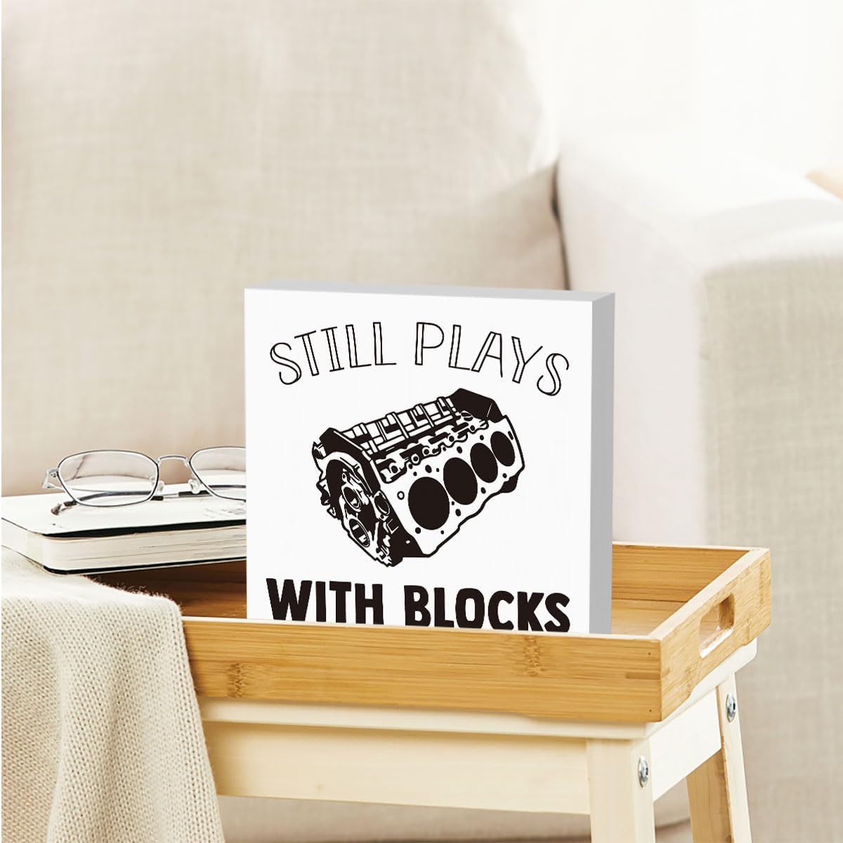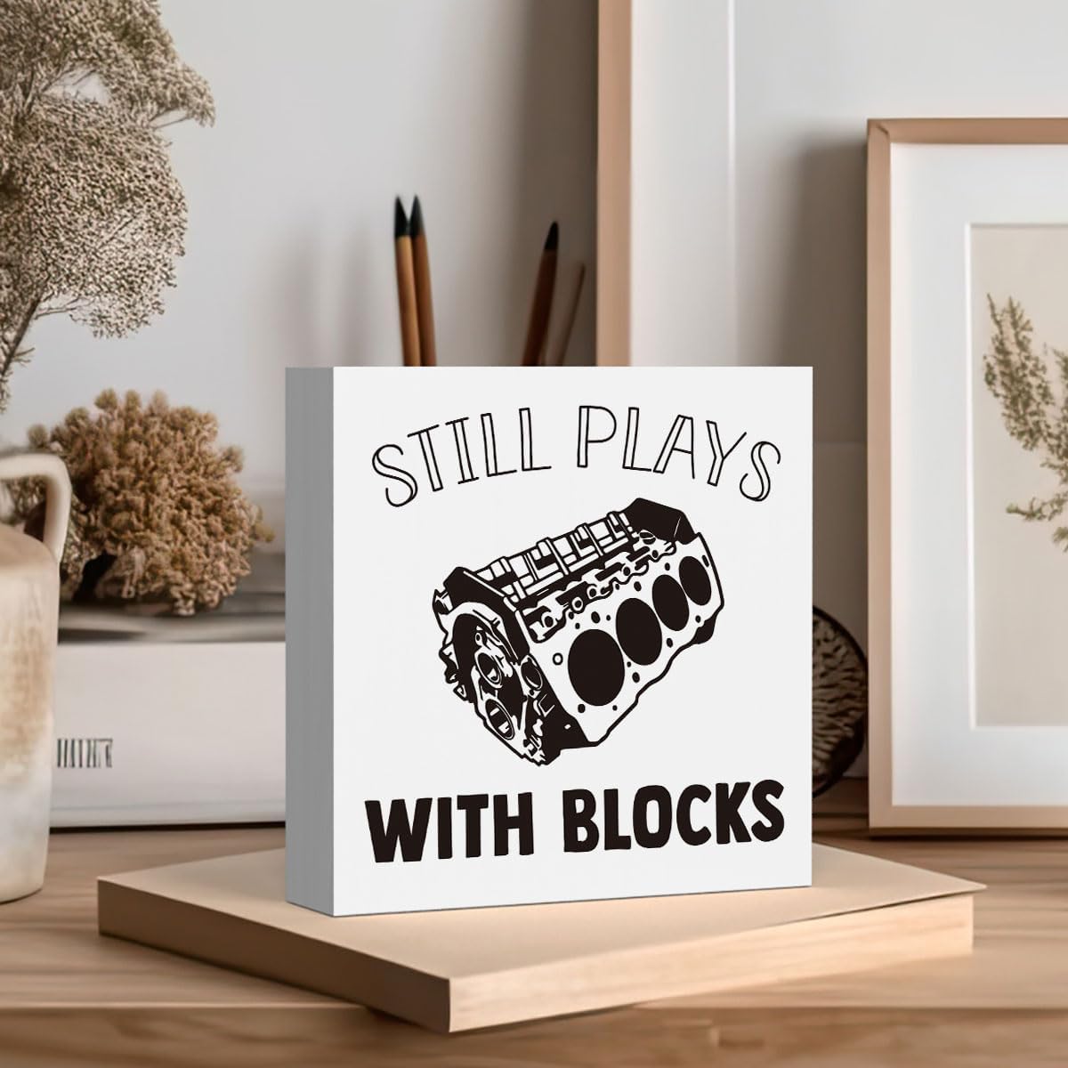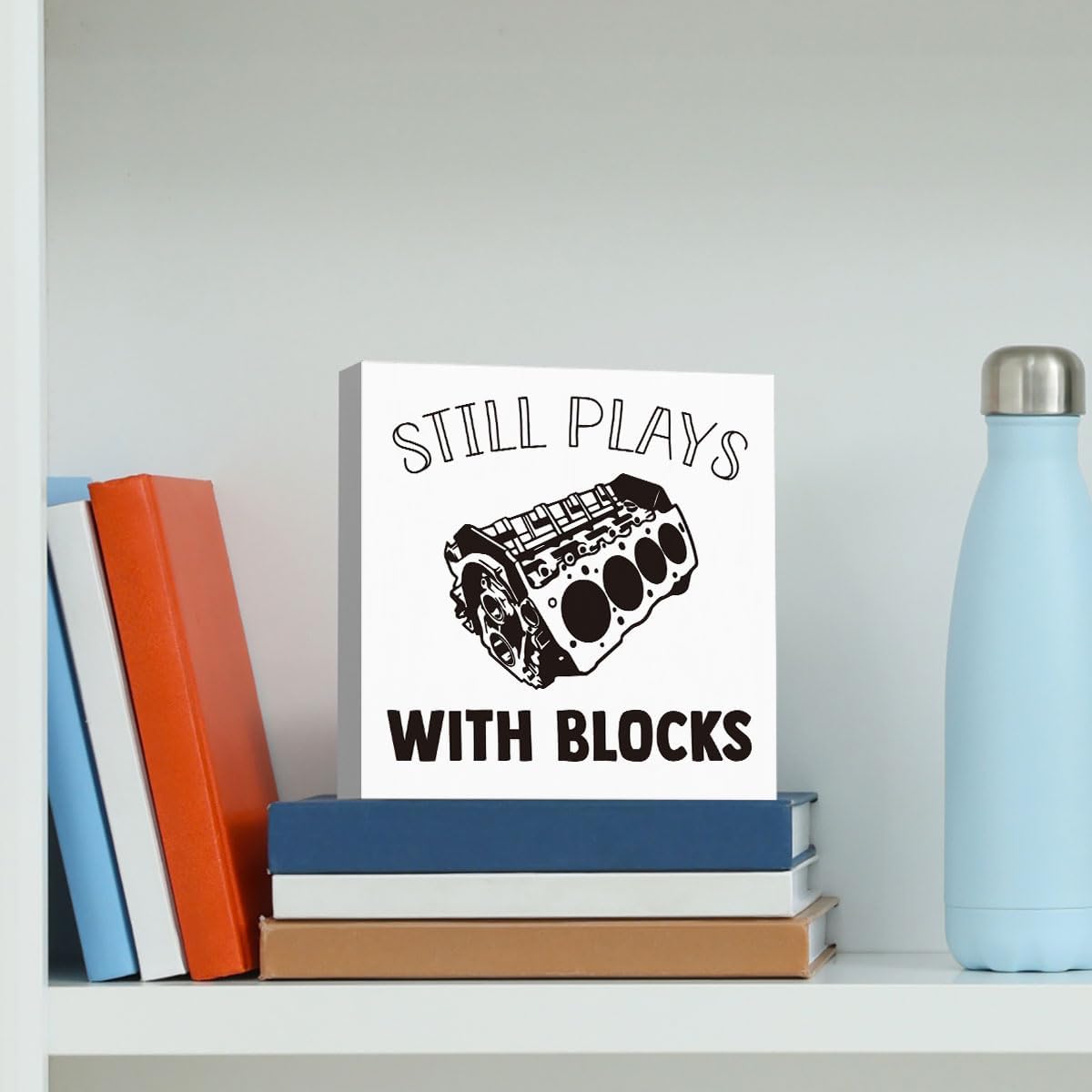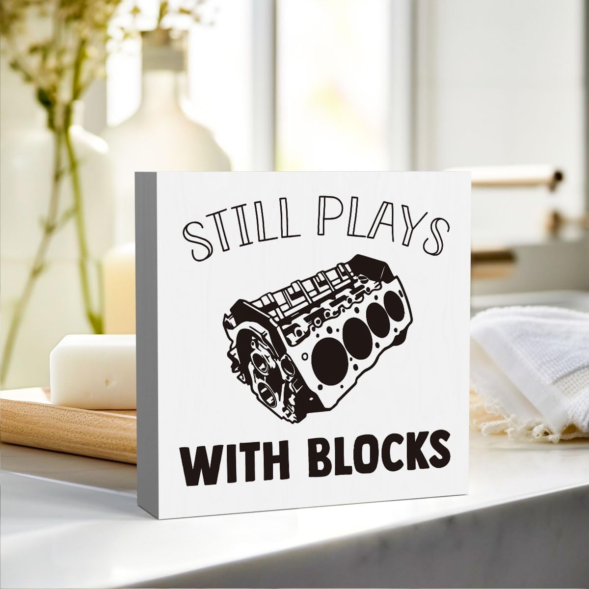 Still Plays With Blocks Sign, Funny Home Office Desk Decorations Gifts for Coworker Colleague Boss Friends Employees, Cubicle Table Shelf Decorations 5 X 5 Inch