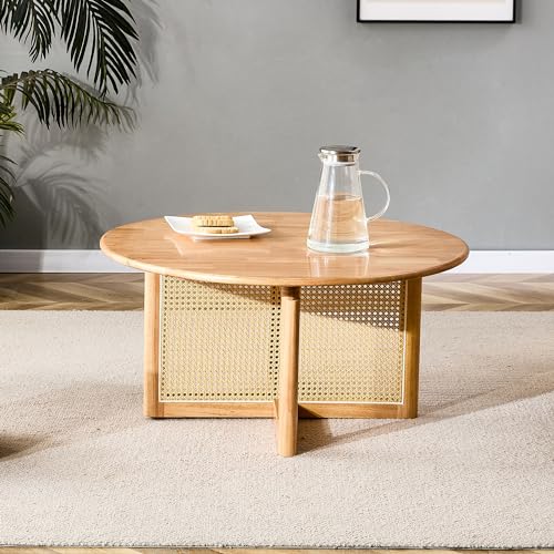 Tzou Round Coffee Table with Rattan Accents Modern Circle Center Table for Living Room Dining Room Bedroom Home Office Natural Wood