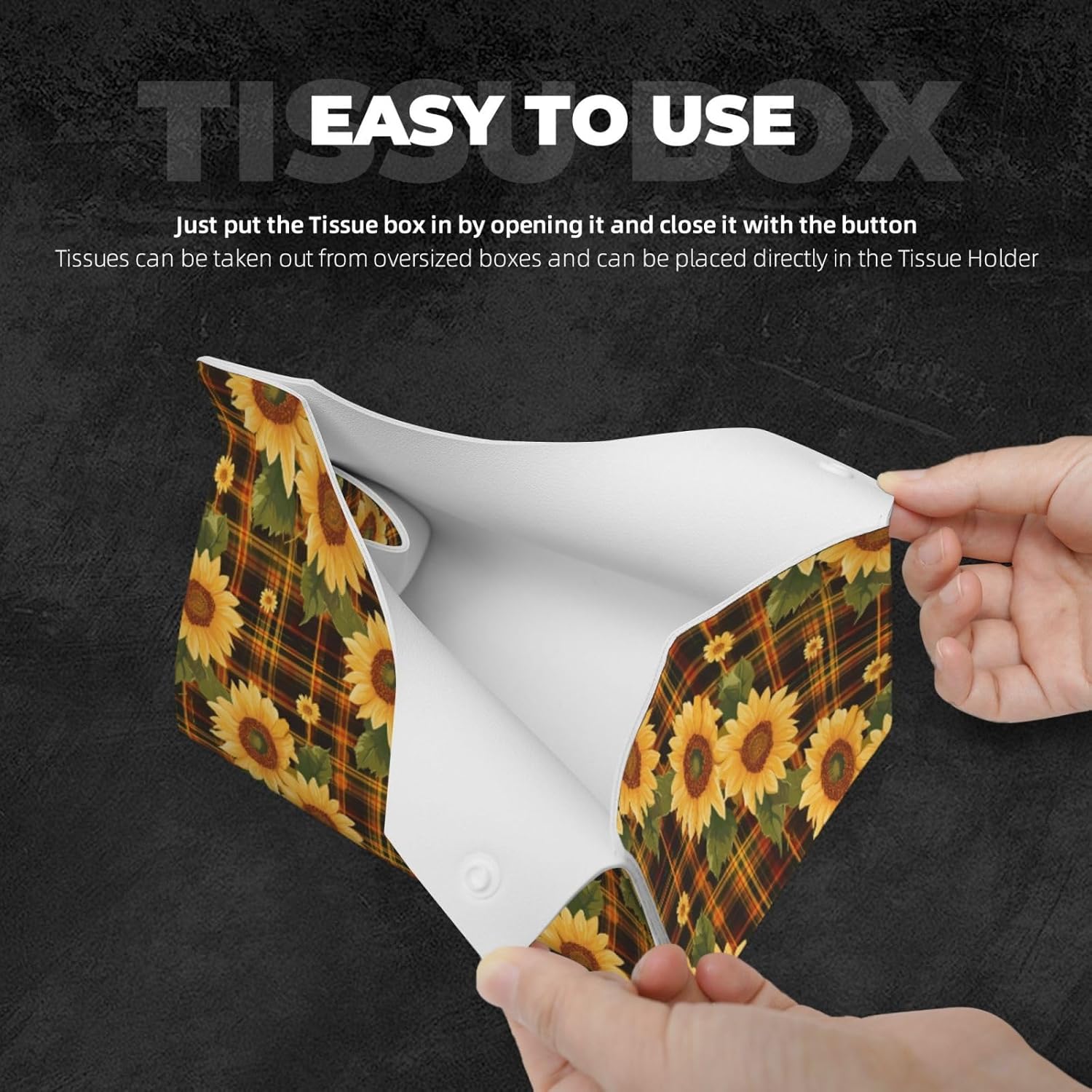 Leather Tissue Box Cover - Yellow Black Plaid Sunflower Long PVC Tissue Box Holder for Bedside Tables, Dining Desks, Tables, Modern Tissue Holder Cover for Bedroom, Office, Living Room Decor