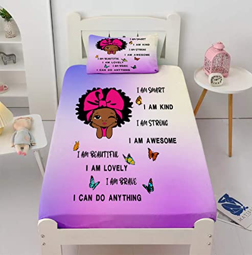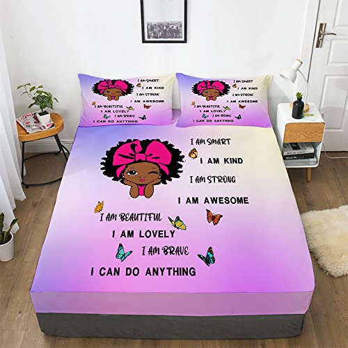 African American Girl Bedding Sets for Girl Black Girl Magic Fitted Sheet Set Cute Little Afro Black Princess Bed Sheet Set for Kids Bedroom Room Decor (1 Fitted Sheet + 2 Pillowcases) Purple