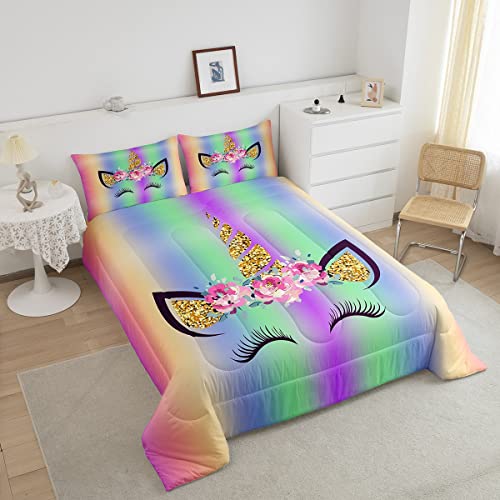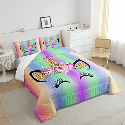 Smiling Eyelashes Princess Girly Comforter Set Full Size,Glitter Dreamy Bedding Set 3pcs for Kids Girls Adults Room Decor,Purple Gradient Glitter Quilt Set,Romantic Cute Duvet Insert,2 Pillowcases