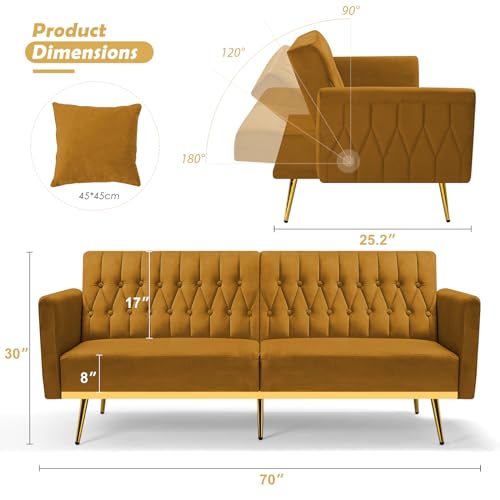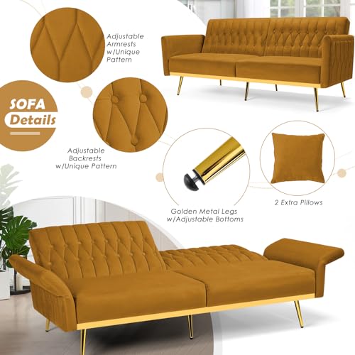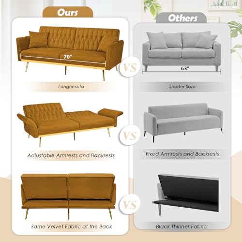 70” Velvet Futon with Adjustable Backrest and Armrests, Sofa Bed with with Extra Pillows for Waiting Room, Living Room and Office, Olive Green