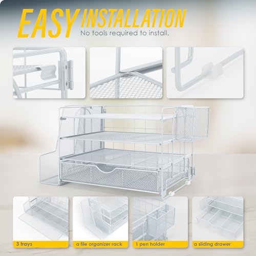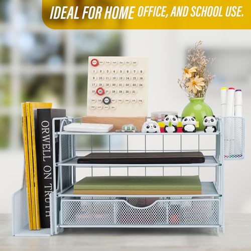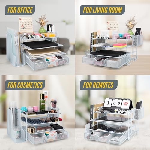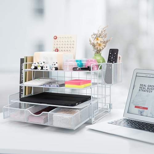 Soilsiu Desk Organizer, Office Desk Accessoreis with Drawer, 4-Tier Dorm Room Essentials for College Students, Pen Holders, Office Supplies Paper File Organizer for Desk, Black