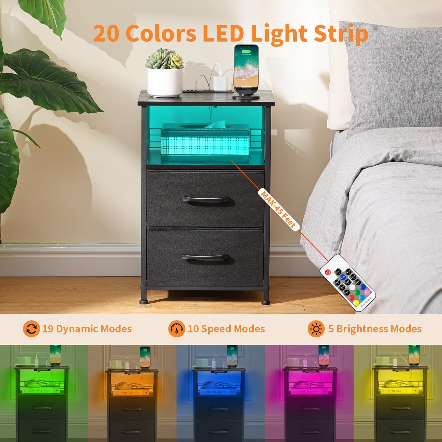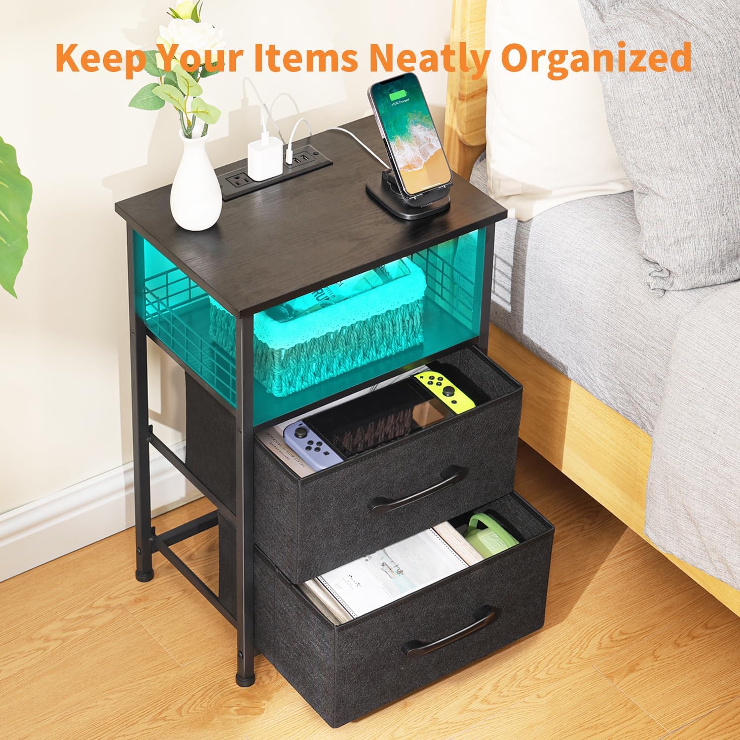 Nightstands Set of 2 with Charging Station, Night Stand with 20 Colors LED Lights and Drawer, Side Table with Charging Station Set of 2 - Small C Table Narrow End Table