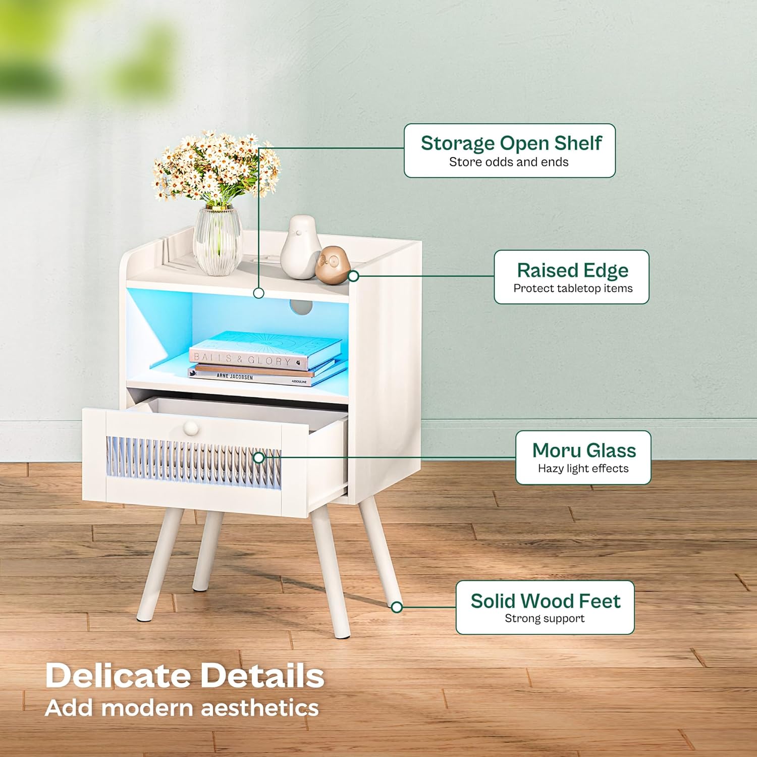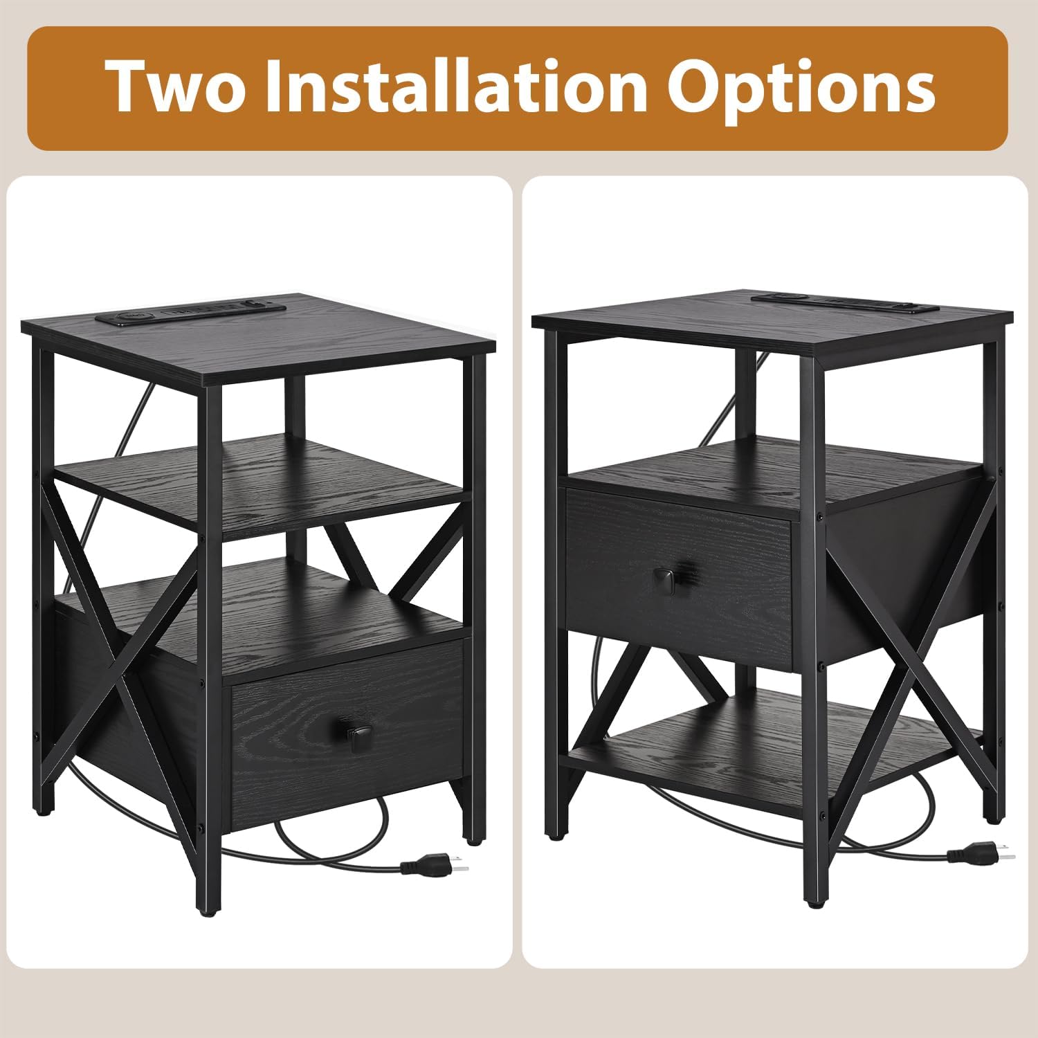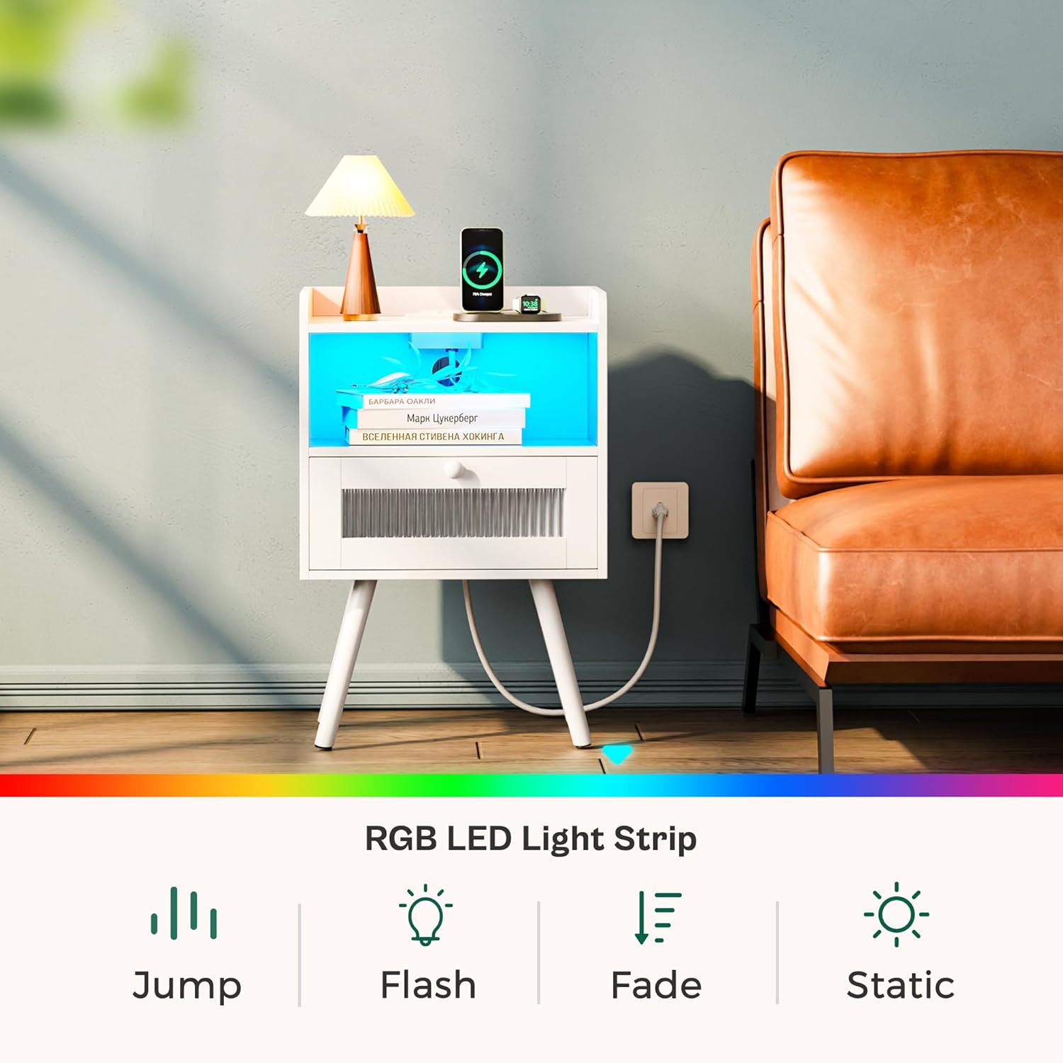 Night Stand Set of 2, Nightstand with Charging Station and LED Light Strips and Drawer, Buffet Cabinet with Storage, Storage Cabinet with 2 Doors, White and Black