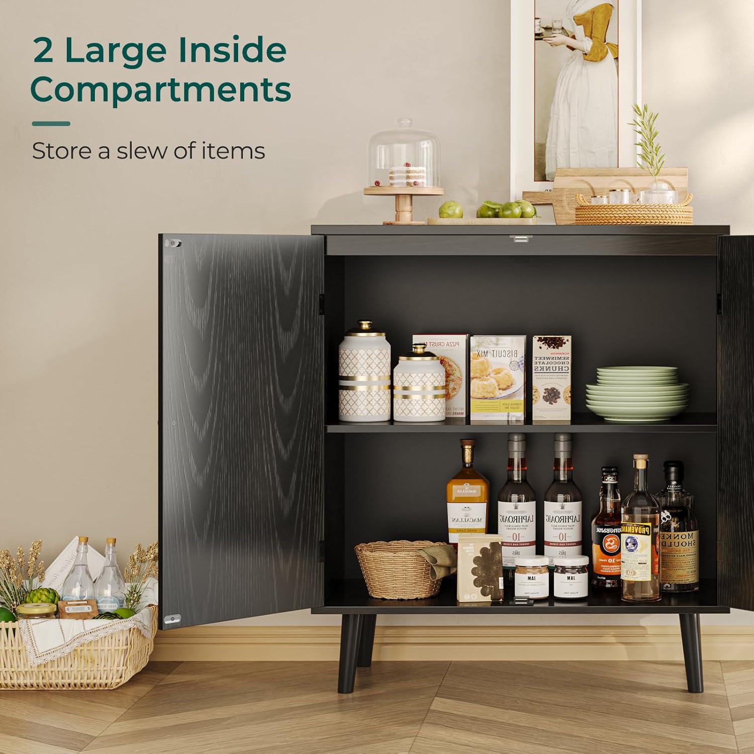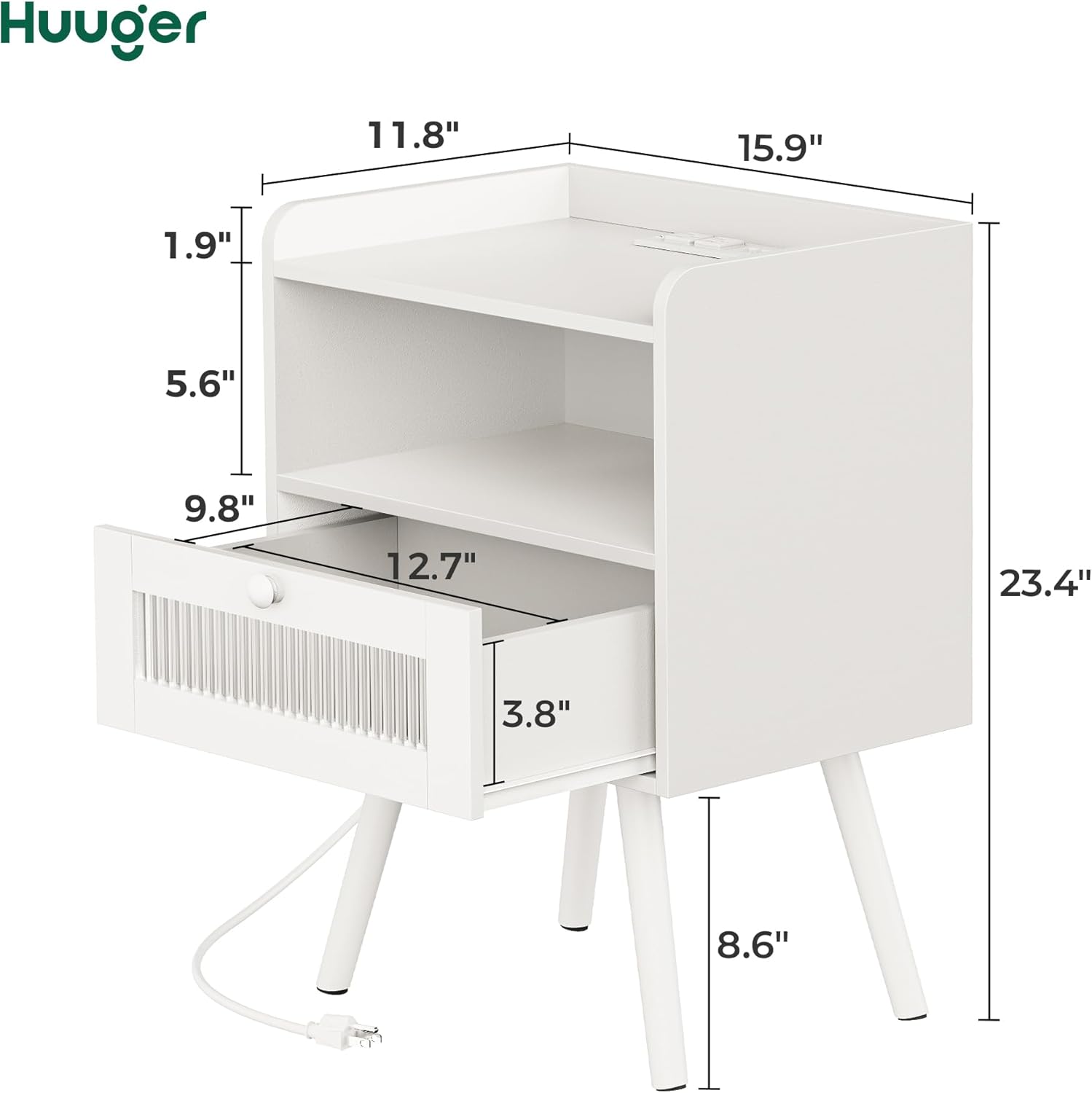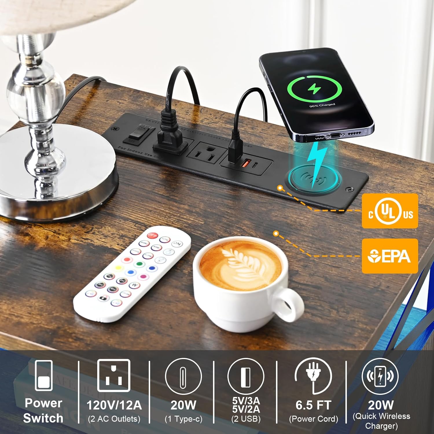 Night Stand Set of 2, Nightstand with Charging Station and LED Light Strips and Drawer, Buffet Cabinet with Storage, Storage Cabinet with 2 Doors, White and Black