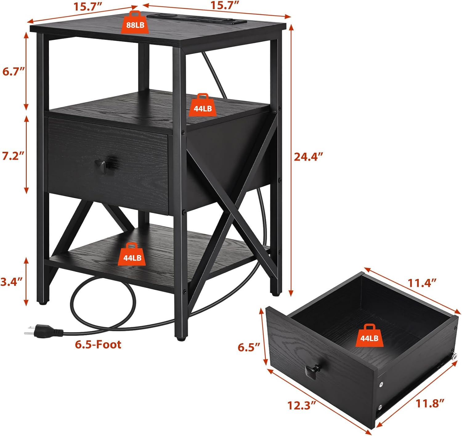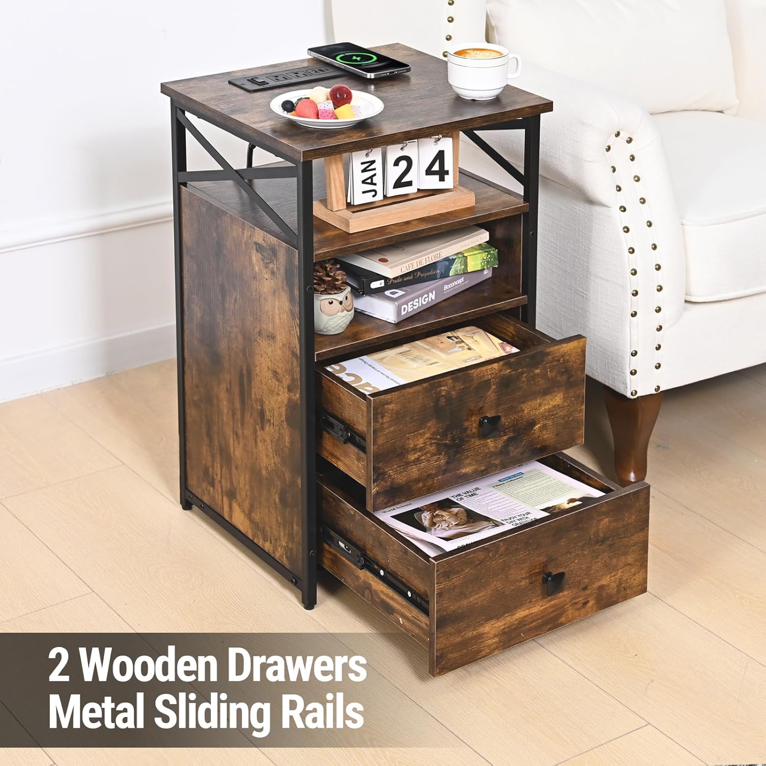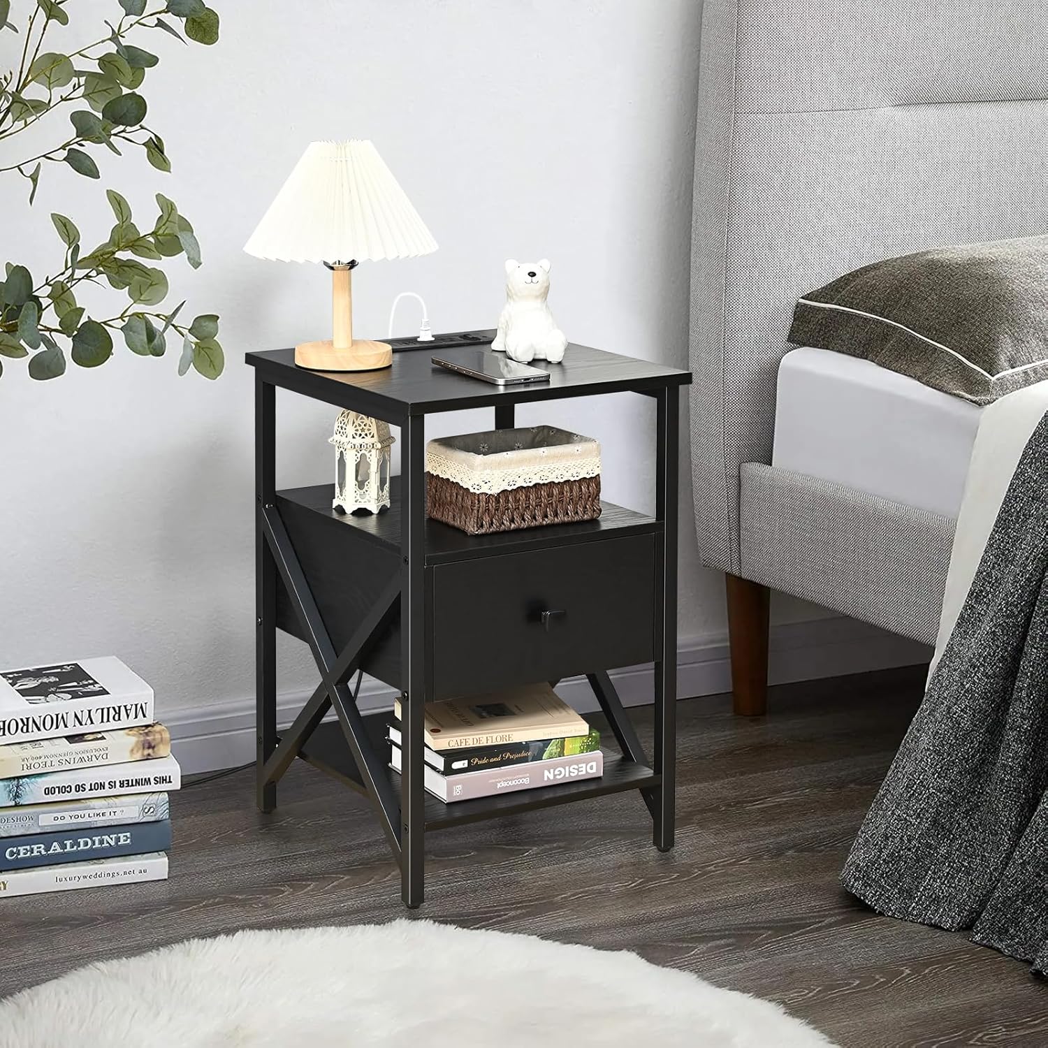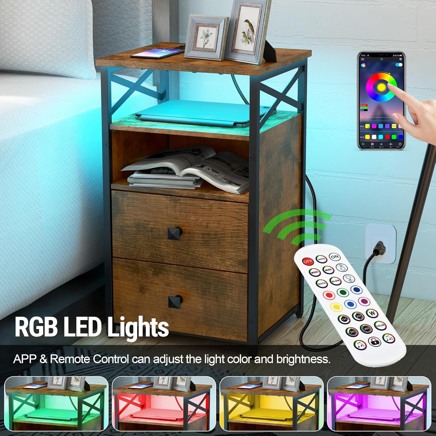 LED End Table with Charging Station Set of 2, Grey Nightstands Set 2 with LED Light and Wireless Charger, Bedside Table with Wooden Drawers, Storage Night Stands for Bedrooms Set of 2