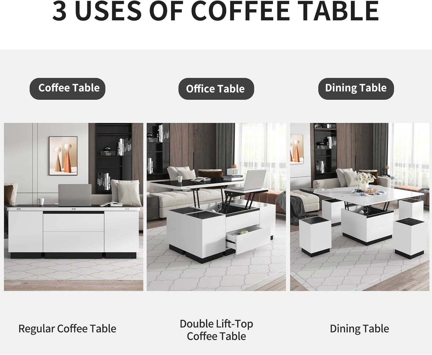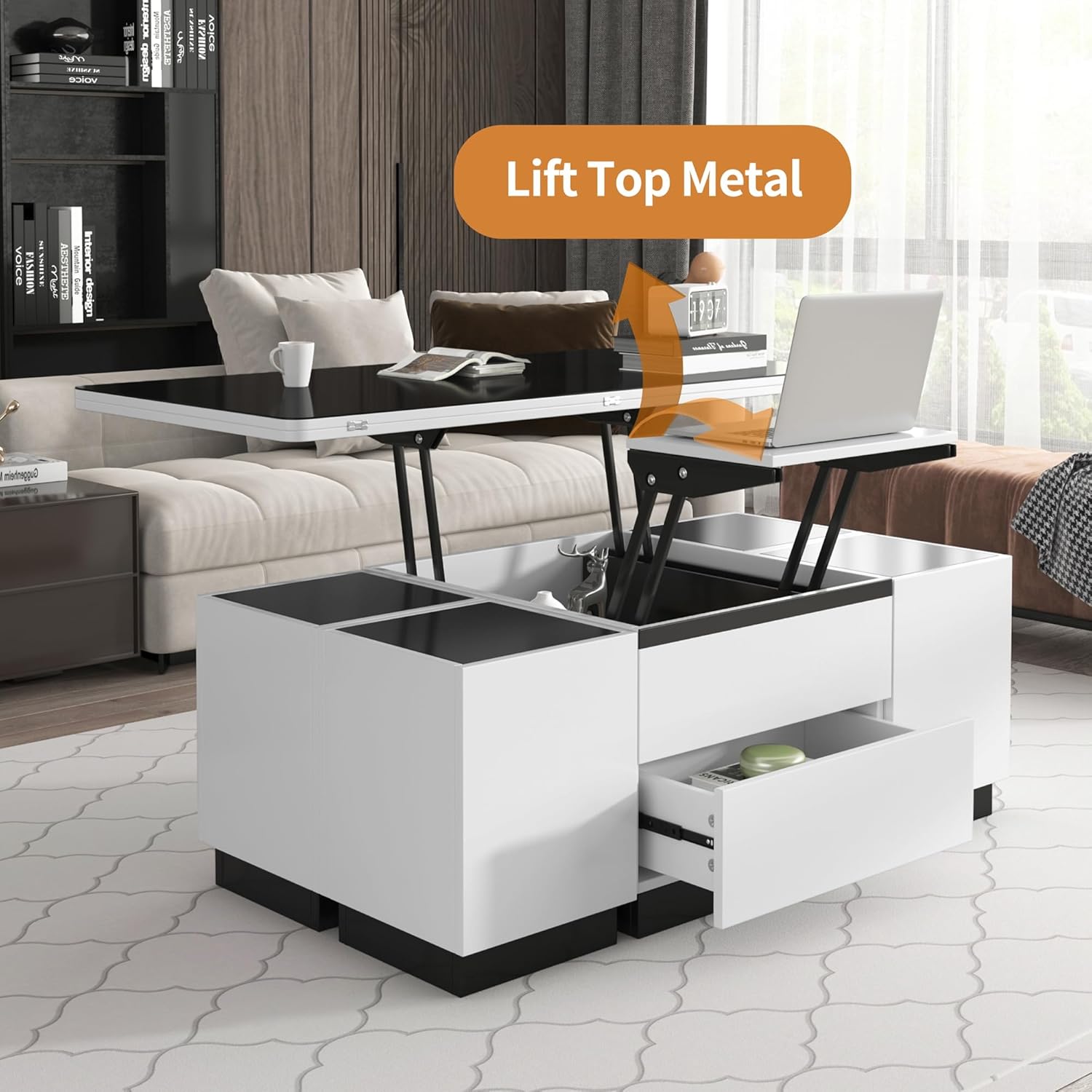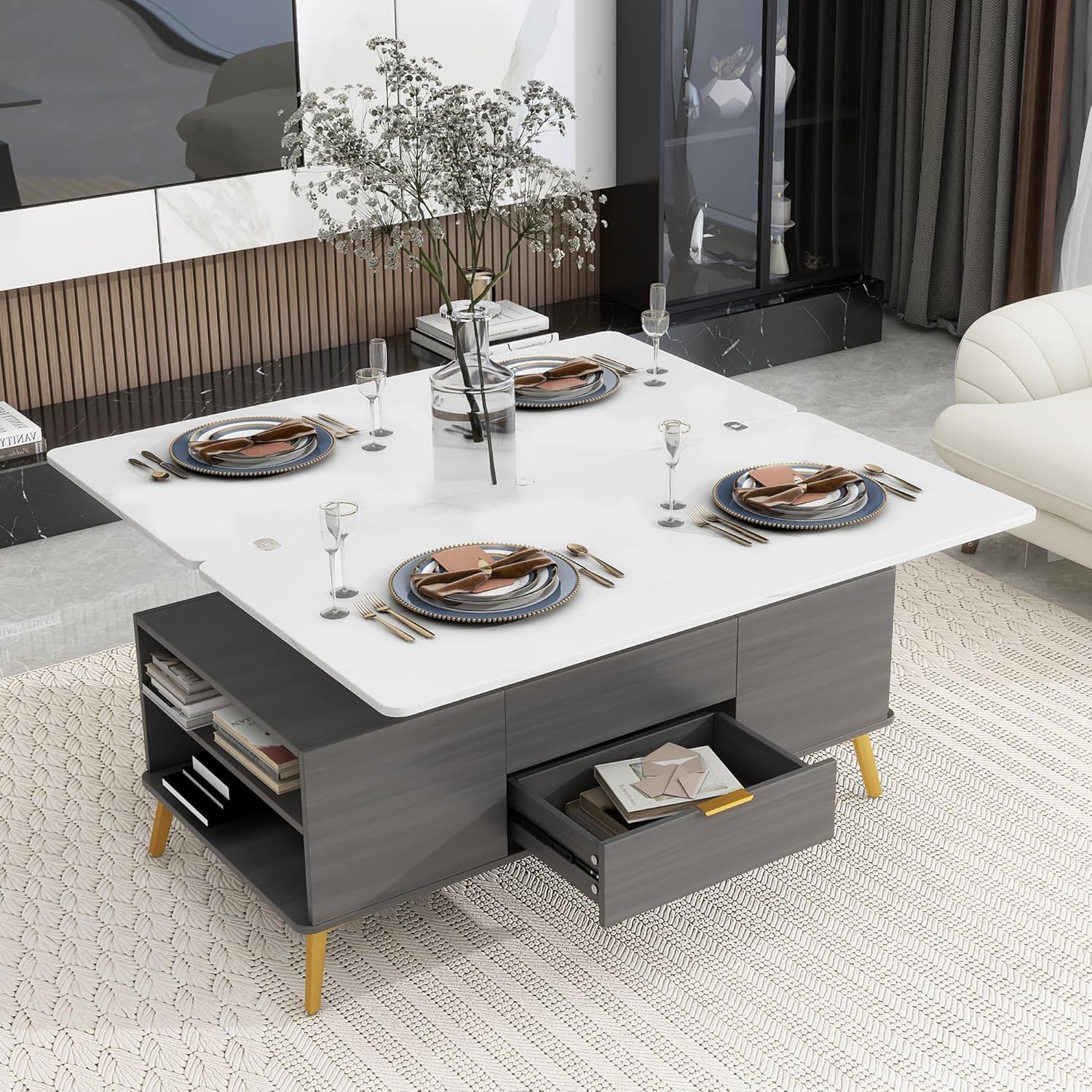 Modern Lift Top Coffee Table Multi Functional Table with Drawers in Gray & White