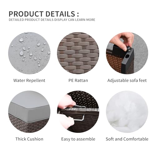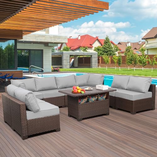 Valita 9-Piece Patio Rattan Furniture Set with Gas Fire Pit Table Outdoor Sectional Conversation Couch Brown PE Wicker Sofa with Washable Navy Blue Cushions